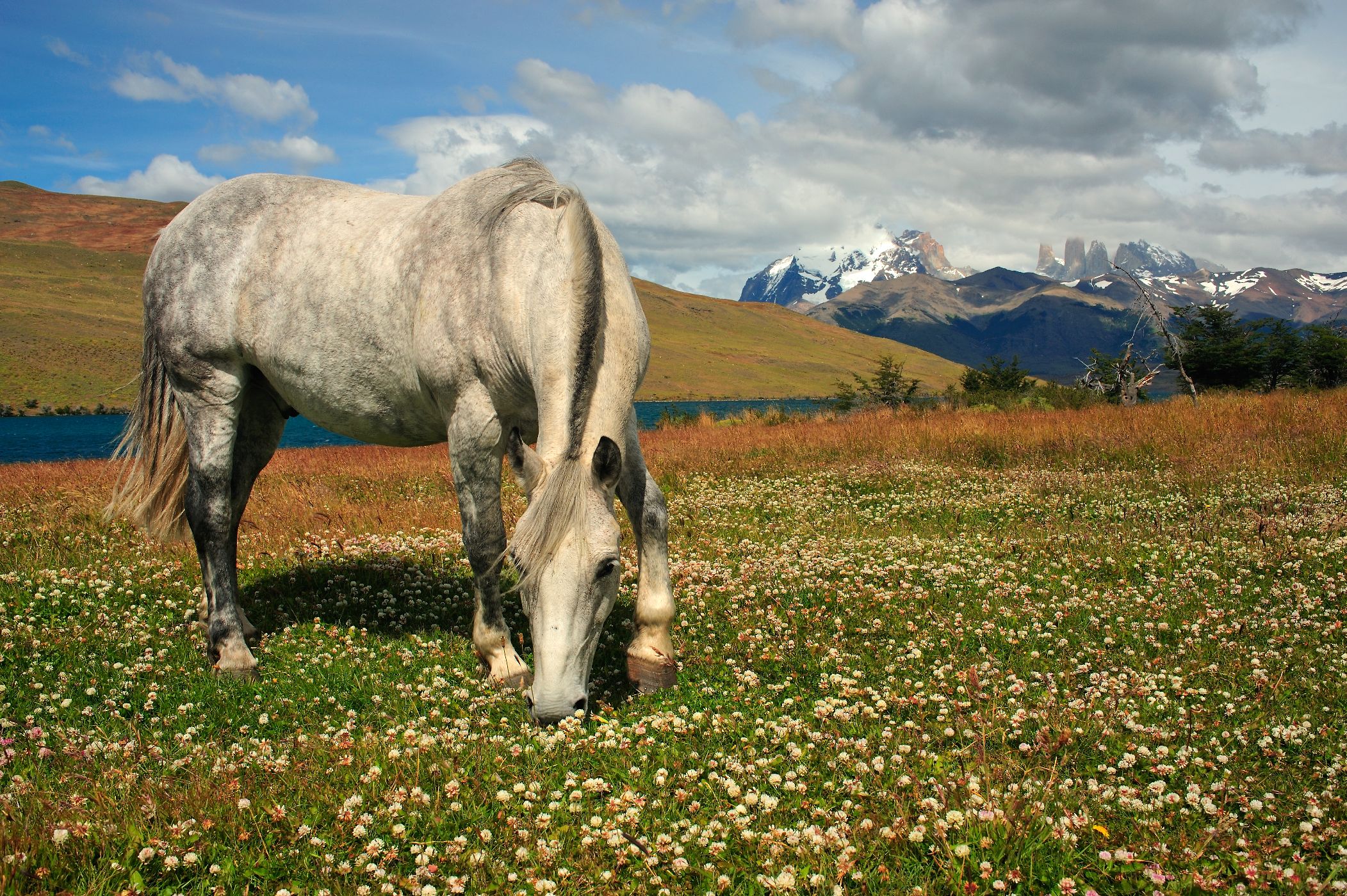 Volně se pasoucí kůň patří ke stádu, které nám zkřížilo cestu u laguny Azul. V pozadí Torres del Paine