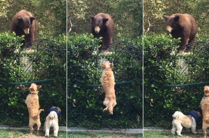 Nerovný souboj: Dvojice psíků zahnala hrozivě vyhlížejícího medvěda