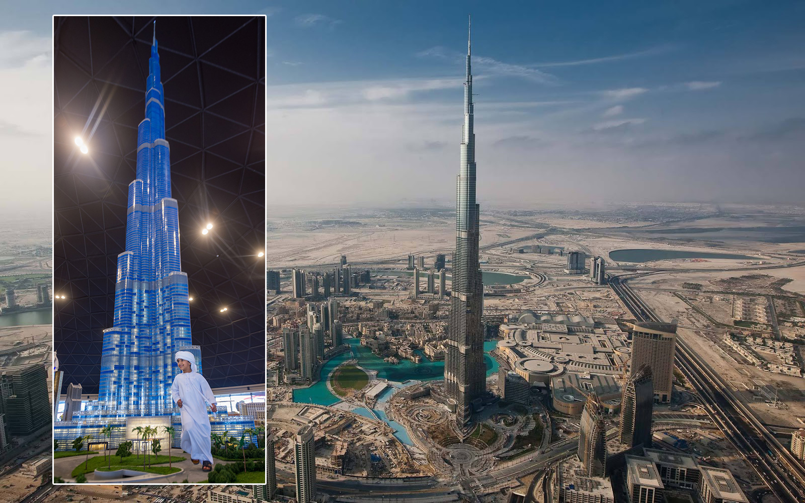Dubajská 827 metrů vysoká Burdž Chalífa a její 17 metrů vysoká maketa z lega.