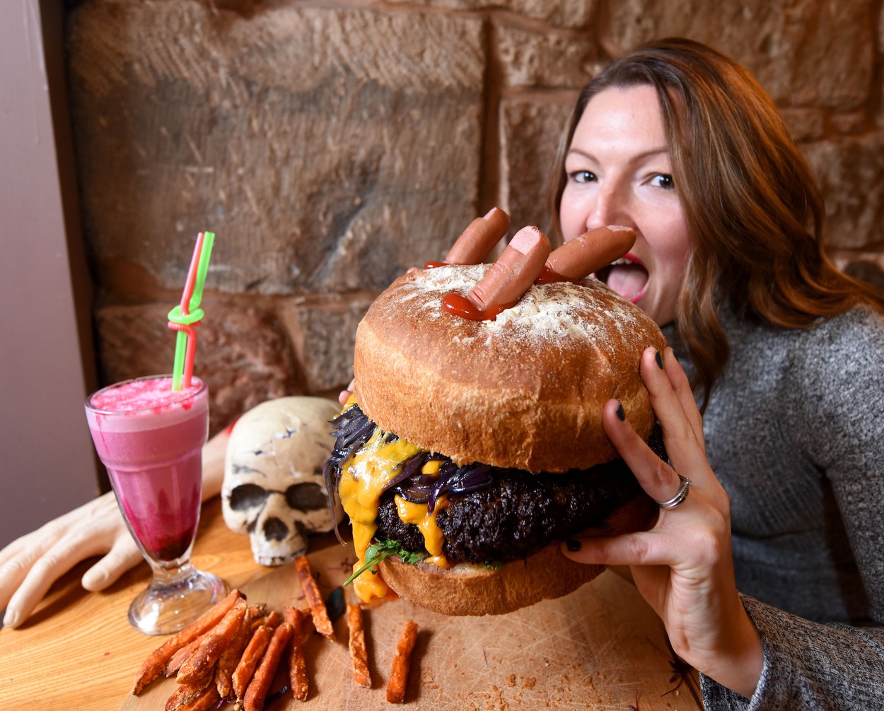 Halloweenský MegaBurger: Kdo zvládne 8 tisíc kilokalorií ve dvoukilové baště?