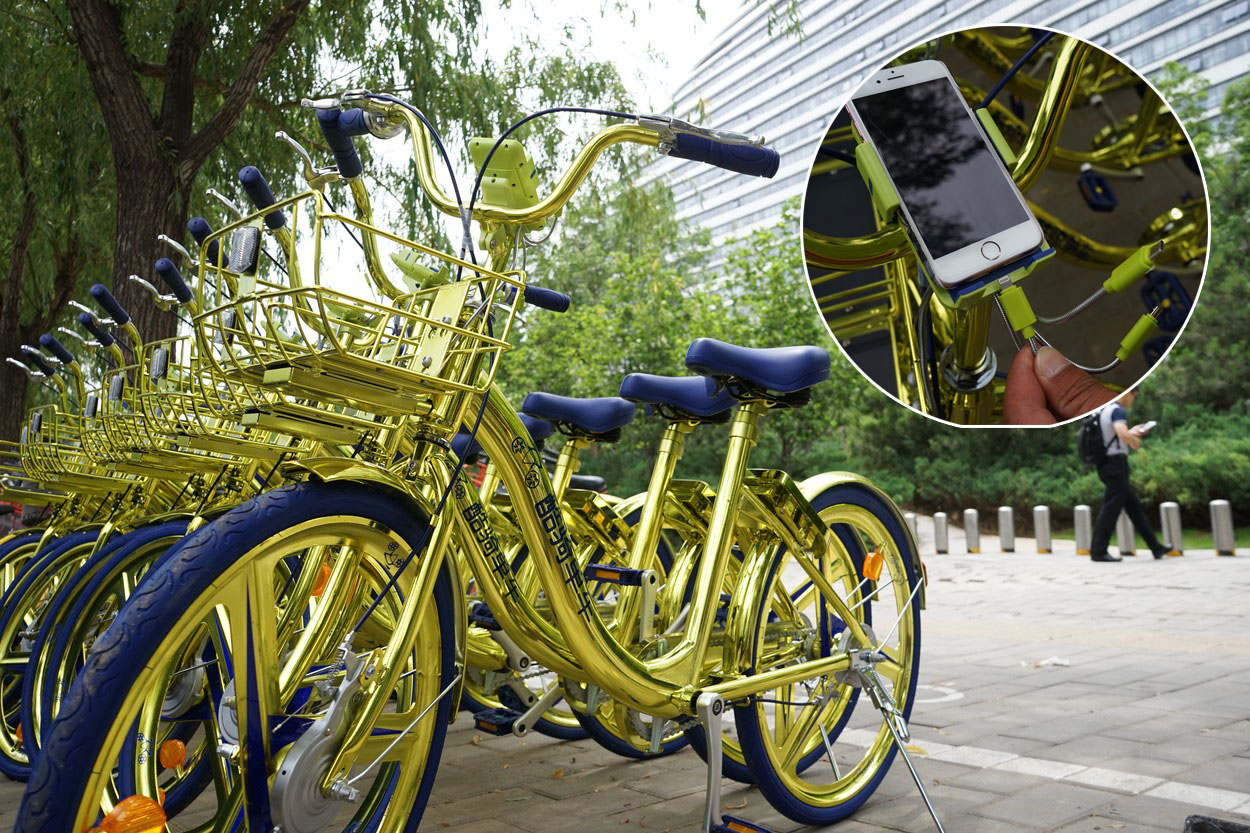 Novinka v ulicích Pekingu: Na zlatém kole si dobijete i mobilní telefon