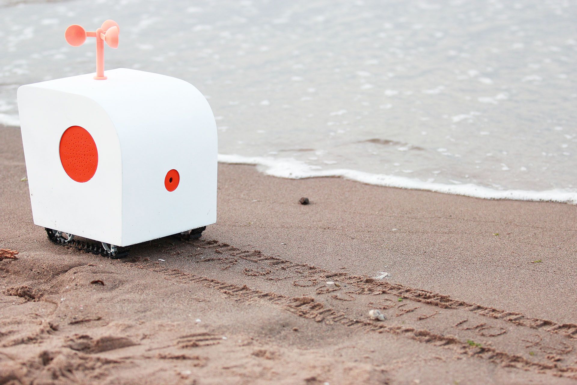 Robopoeta na pobřeží: Robůtek sám skládá básně a zapisuje je do písku