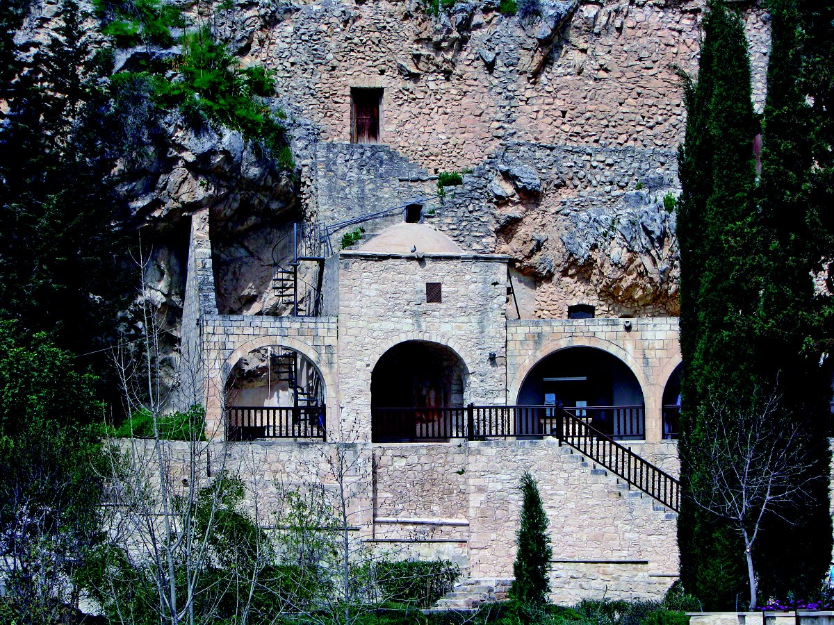 Vstupní pohled na nádvoří kláštera svatého Neofyta. Nahoře je vidět druhá jeskyně, kterou si vyhloubil, aby unikl svým nechtěným žákům.