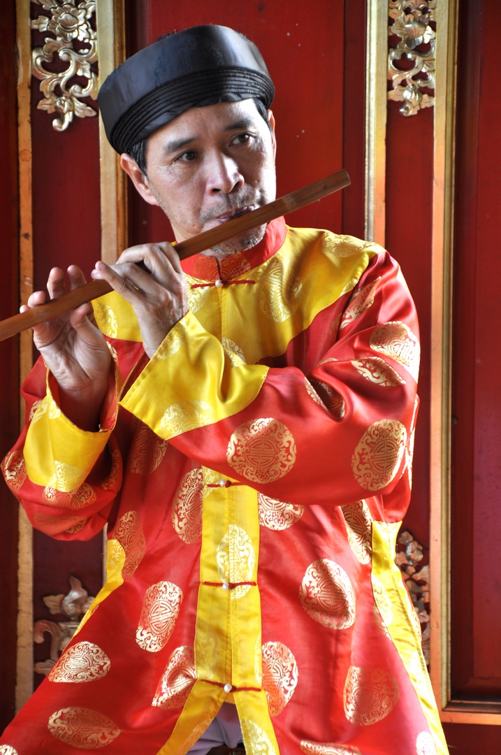 Muzikanti představují turistům tradiční vietnamskou hudbu.