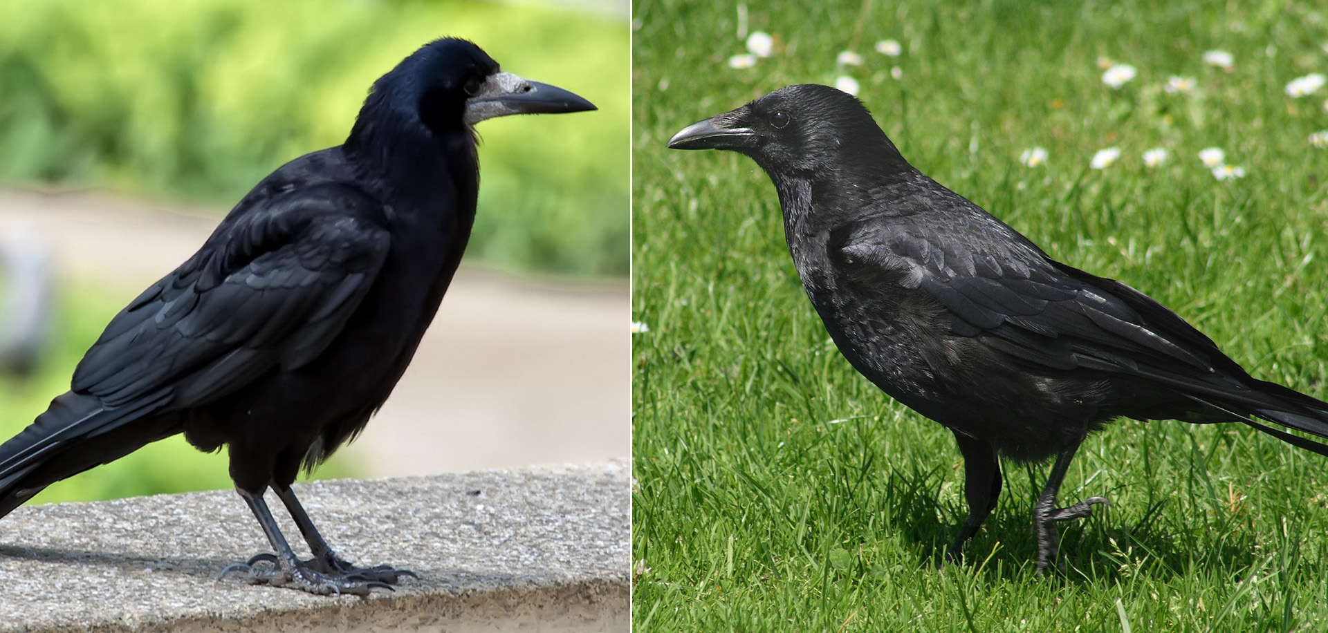 Vrána, nebo havran? Zatímco vráně se peří na slunci leskne zelenkavě a její zobák má barvu černou, havraní peří je namodralé a zobák šedý, u dospělých jedinců s výraznou lysinou u kořene.