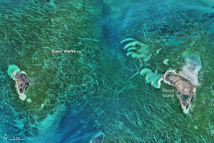 Čí je to práce? Satelitní snímek Kaspického moře ukazuje záhadné čáry