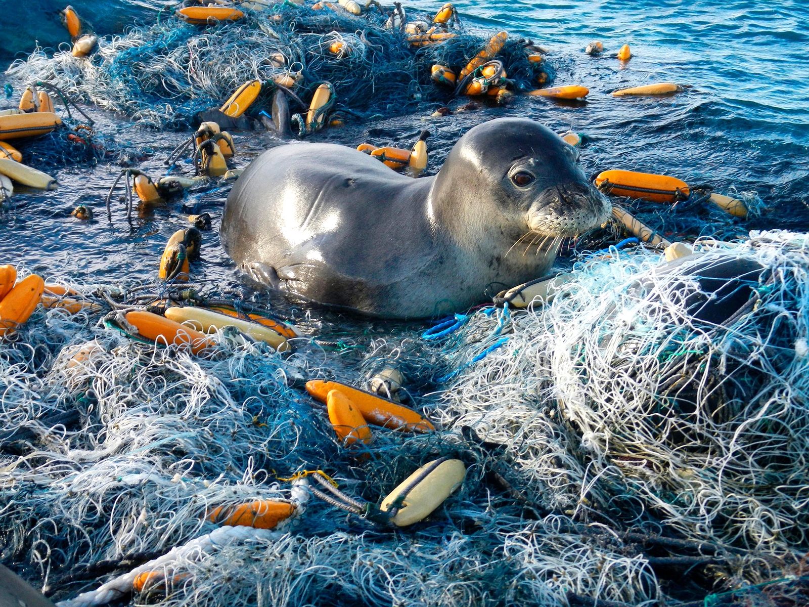 Tuleň havajský uvízl v rybářské síti u jednoho z Havajských ostrovů.