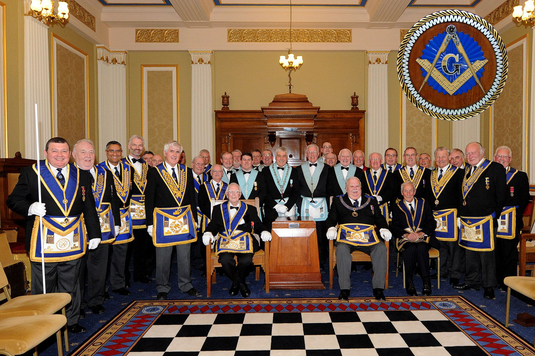 Svobodní zednáři ve slavnostním úboru - Zednářský znak tvoří úhelník, kružidlo, případně i písmeno G, odkazující na geometrii nebo slovo gnosis (řecky „poznání“).
