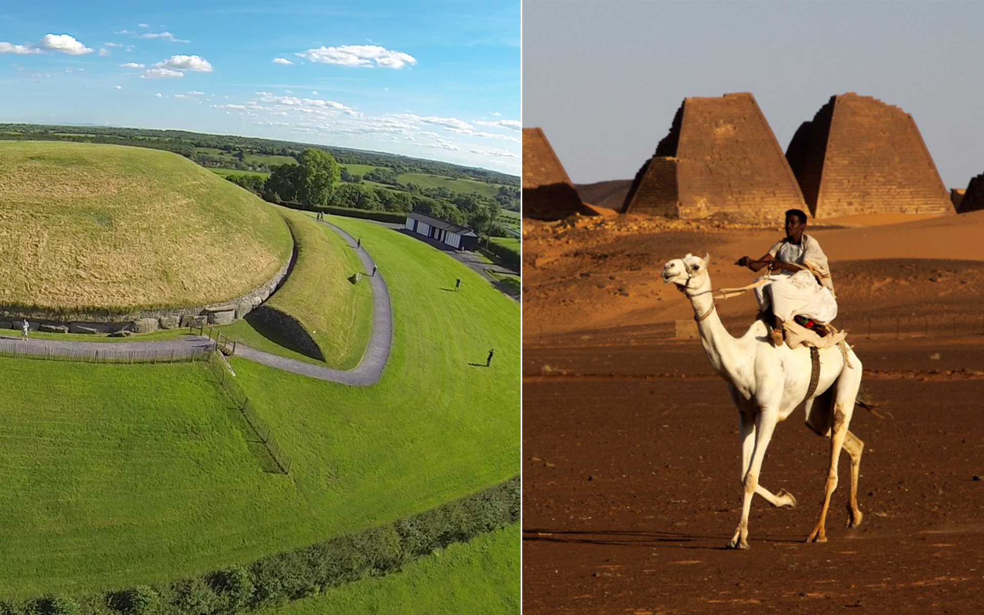 Podobně jako zůstával Newgrange (vlevo) dlouho ve stínu známějšího Stonehenge, zanikaly také núbijské pyramidy v lesku slavnějších kolegyň v Gíze.