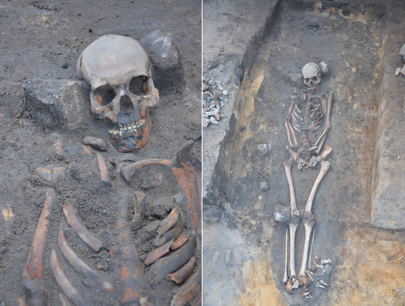 Hlava jedné z koster byla uvězněna mezi dvěma velkými kameny – pole archeologů jde o jeden z mnoha rituálů používaných při upírských pohřbech.