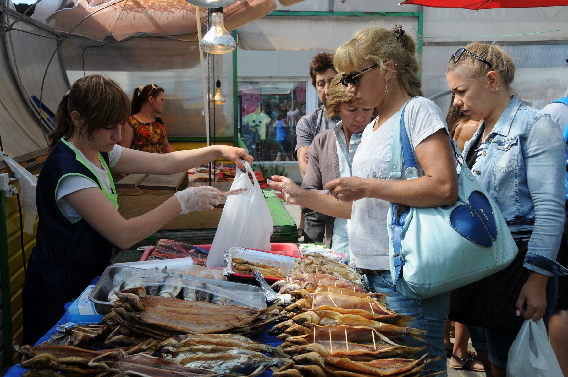 Nedílnou součástí irkutské tržnice je typický odér z oblíbených sušených či uzených ryb.