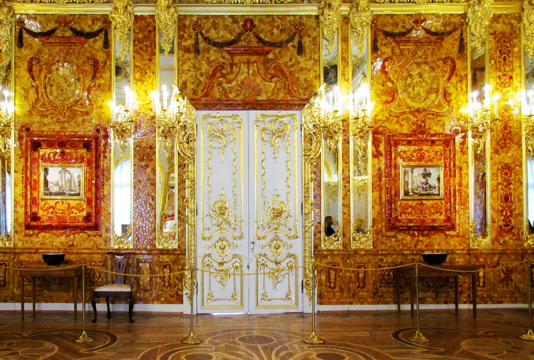 Kopie jantarové komnaty v Kateřinském paláci v Carském Selu. Jantarovou výzdobu doplňuje zlacení a mozaiky.