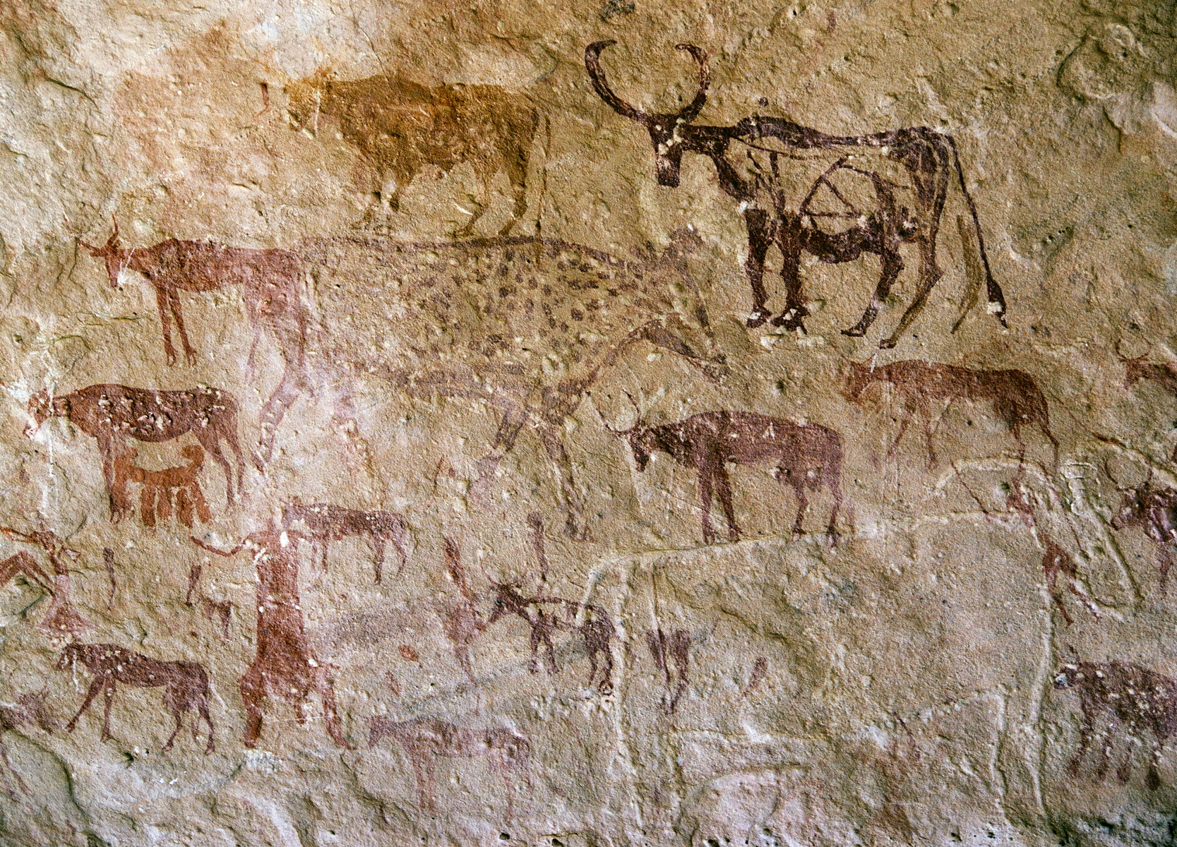 Pravěké malby a rytiny zachycují historii Sahary v posledních deseti tisících letech: velká africká zvířata vystřídal domestikovaný skot, který s rozšířením pouště nahradili dromedáři
