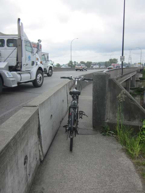 Cyklistický nájezd na most Knight Street Bridge je tak úzký, že se do mezery stěží vejde kolo bez jezdce.