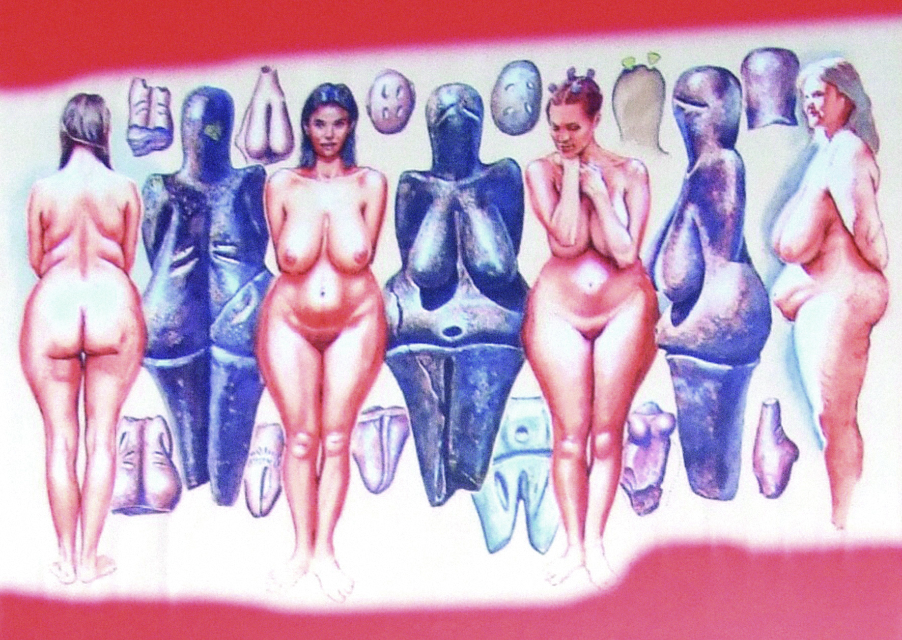Souladná malba ženy vycházející ze sošek venuší z Dolních Věstonic.