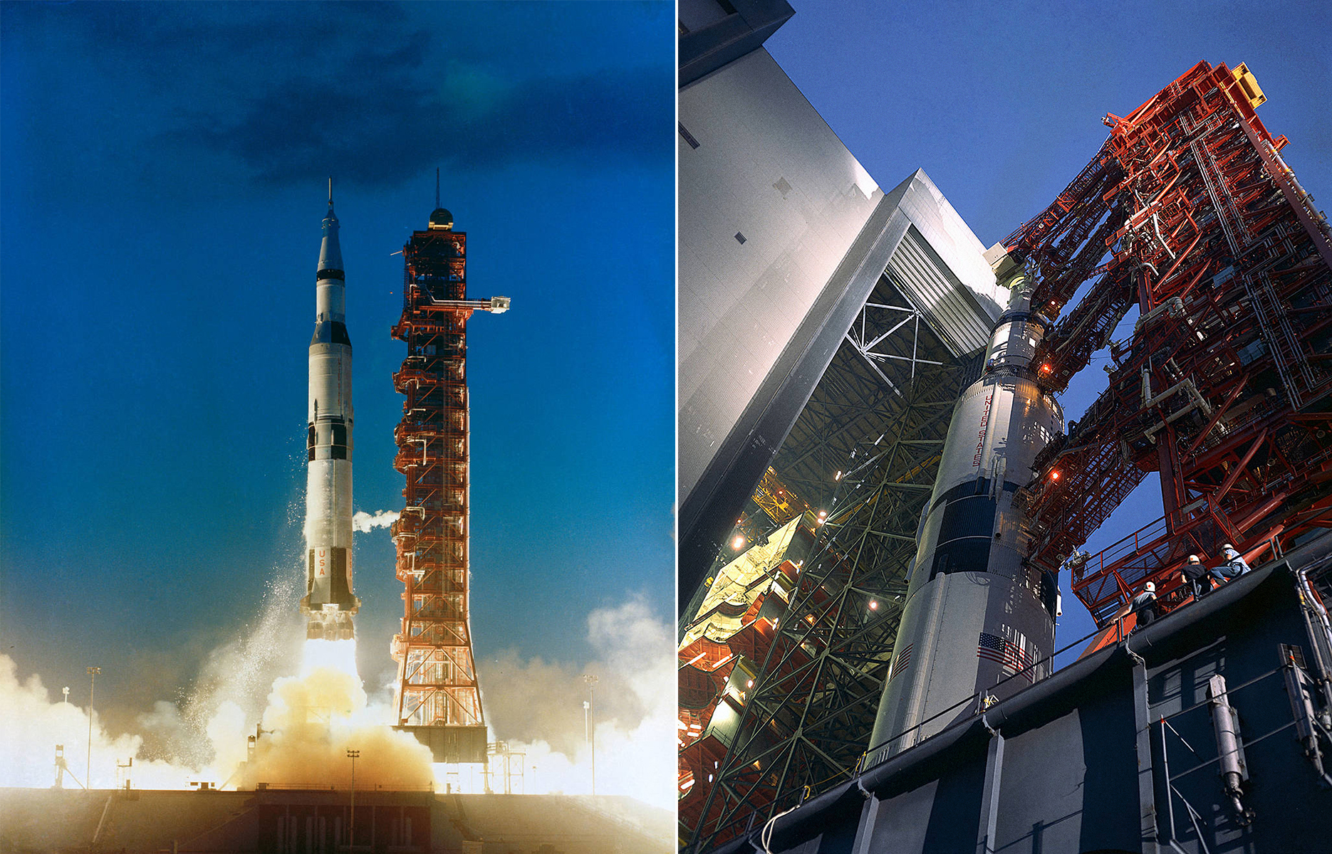 Premiérový start Saturnu V s lodí Apollo 4 (vlevo) a 111 metrů vysoký Saturn V opouštějící na transportéru montážní halu VAB.
