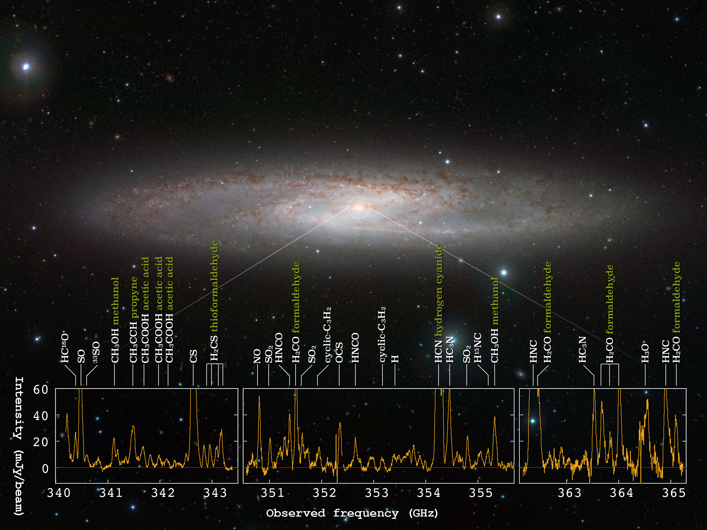 Spektrum záření z centra galaxie Sochař obsahuje stopy přítomnosti 19 organických molekul