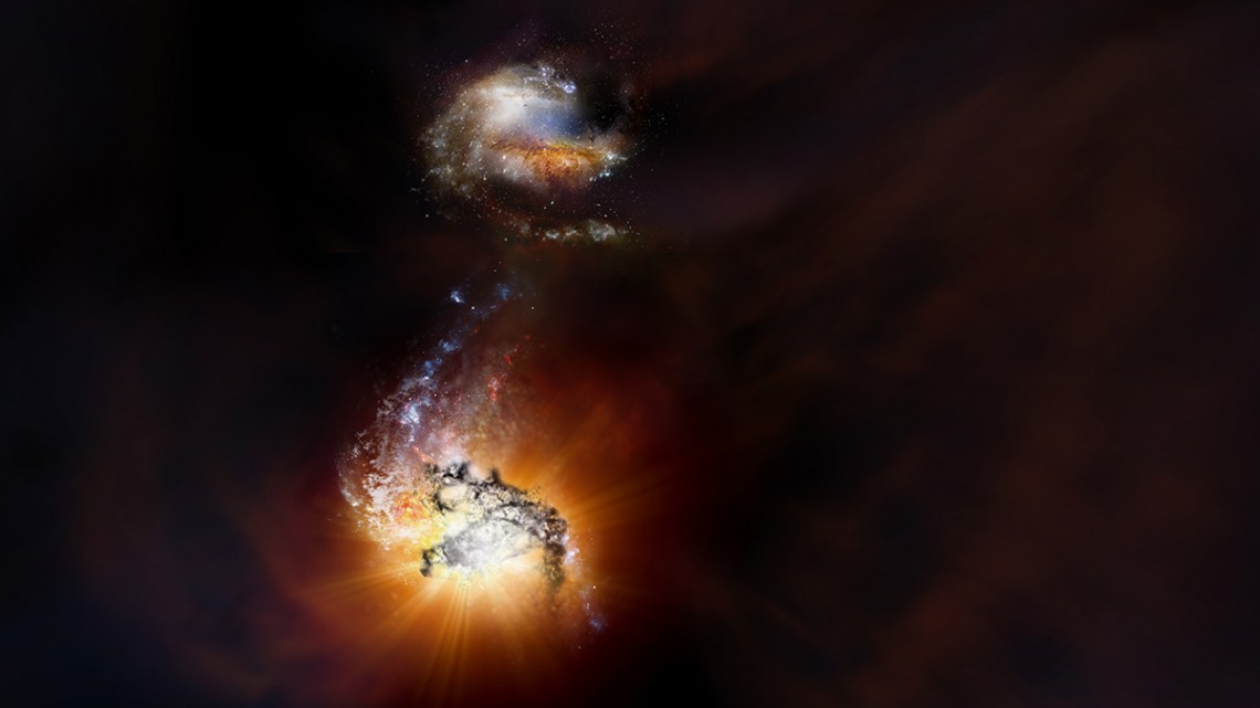 Umělecká rekonstrukce splývání dvou galaxií v pradávném vesmíru