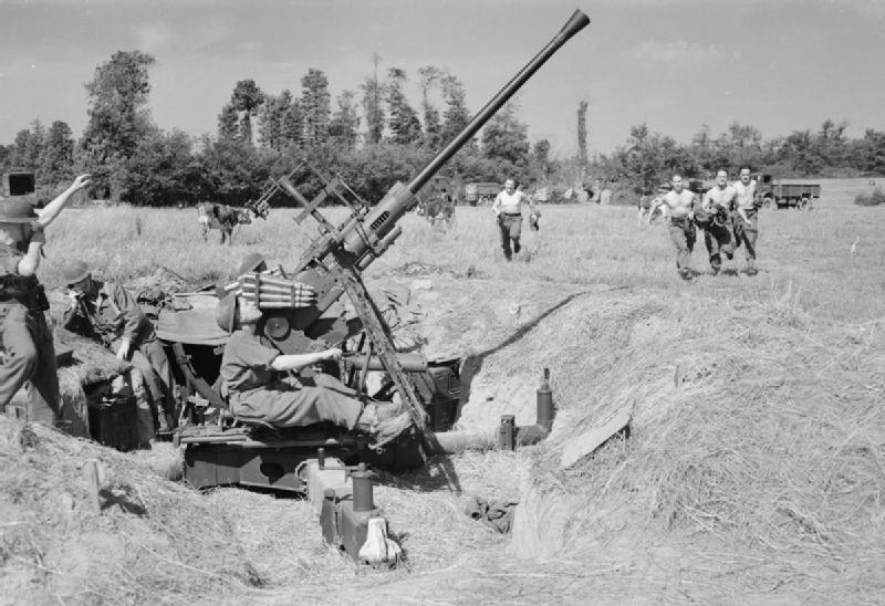 Obsluha 40mm kanonu Bofors vyhlíží v létě 1944 v Normandii letouny nepřítele