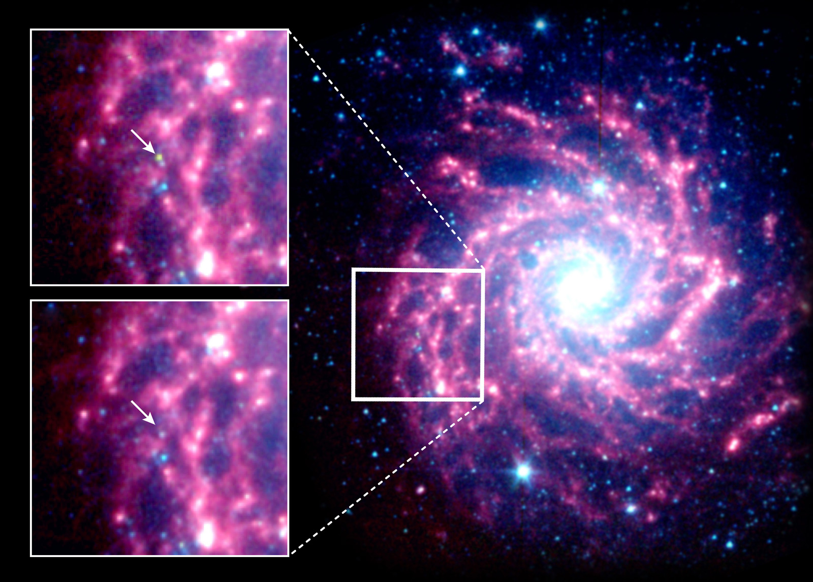 • Snímek ze Spitzerova kosmického teleskopu ukazuje prach a plyn, který se koncentruje kolem vzdálené supernovy v galaxii M74