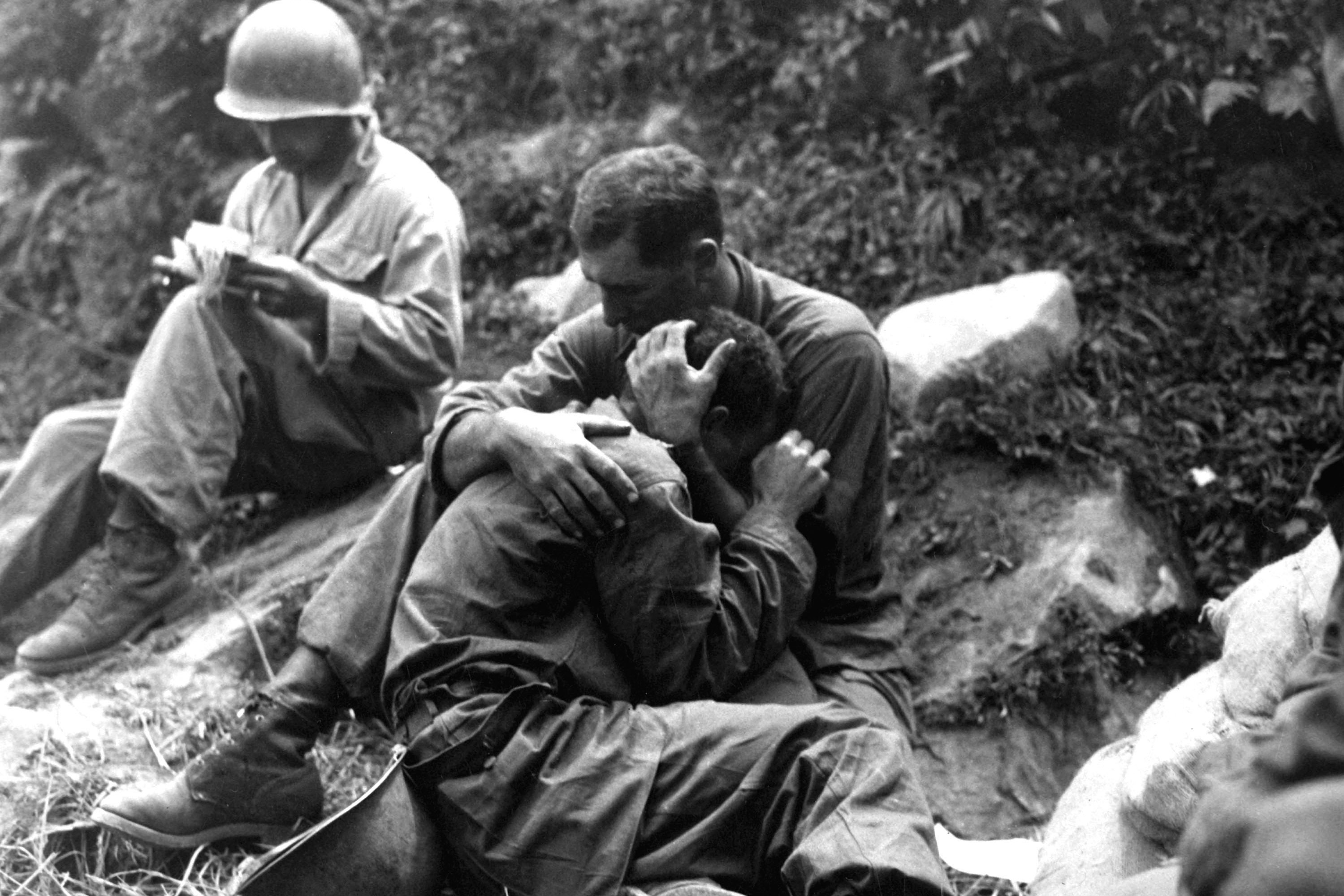 Vraždy zajatců byly především v počáteční fázi celkem běžné. Voják na snímku utěšuje spolubojovníka poté, co se dozvěděl o smrti svého kamaráda