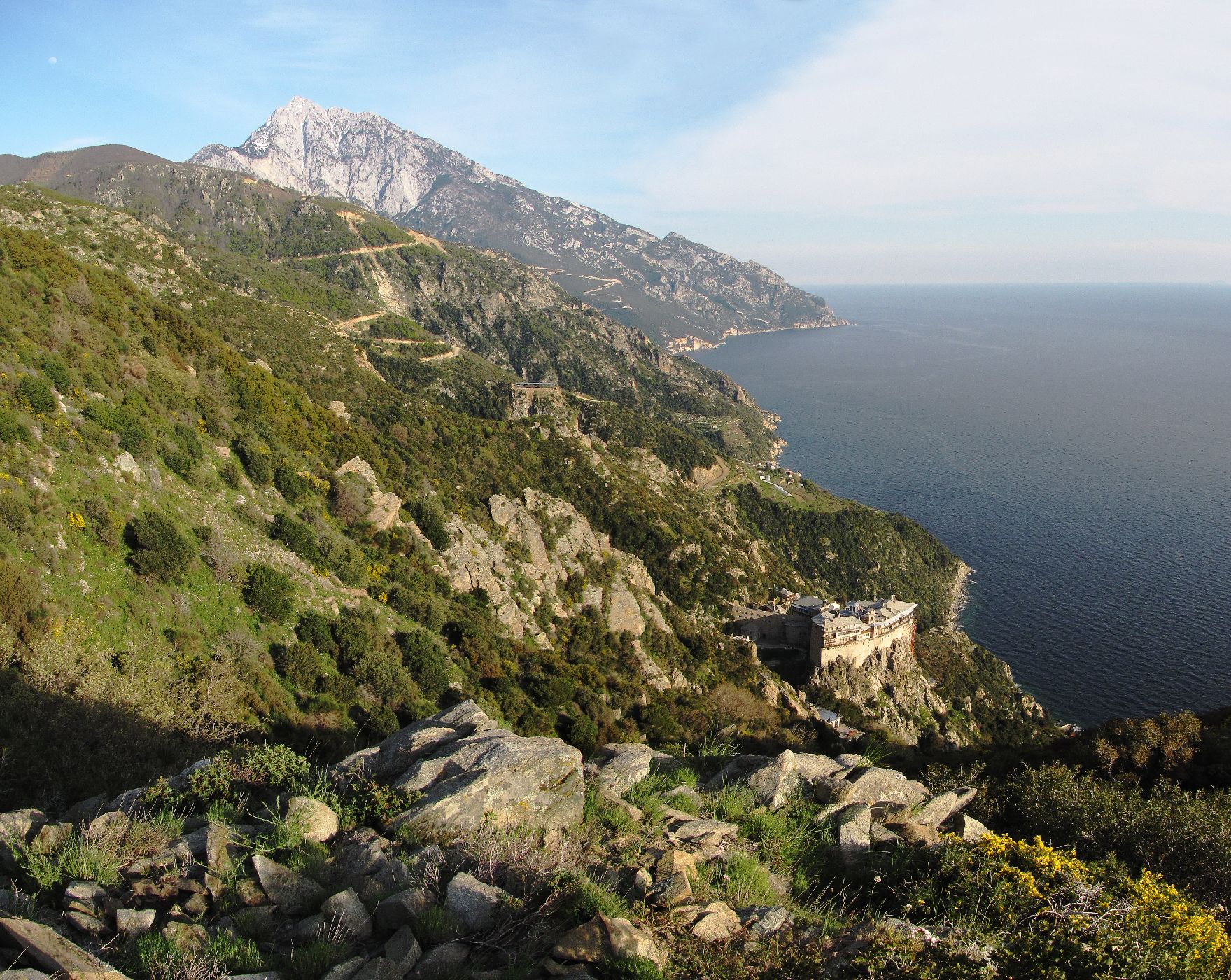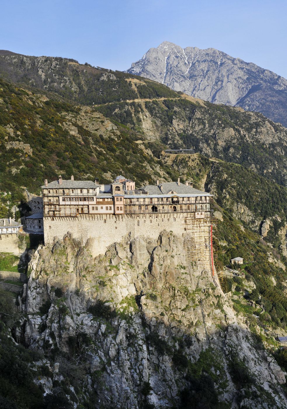 • Klášter Simonos Petras s majestátním vrcholem Athosu v pozadí