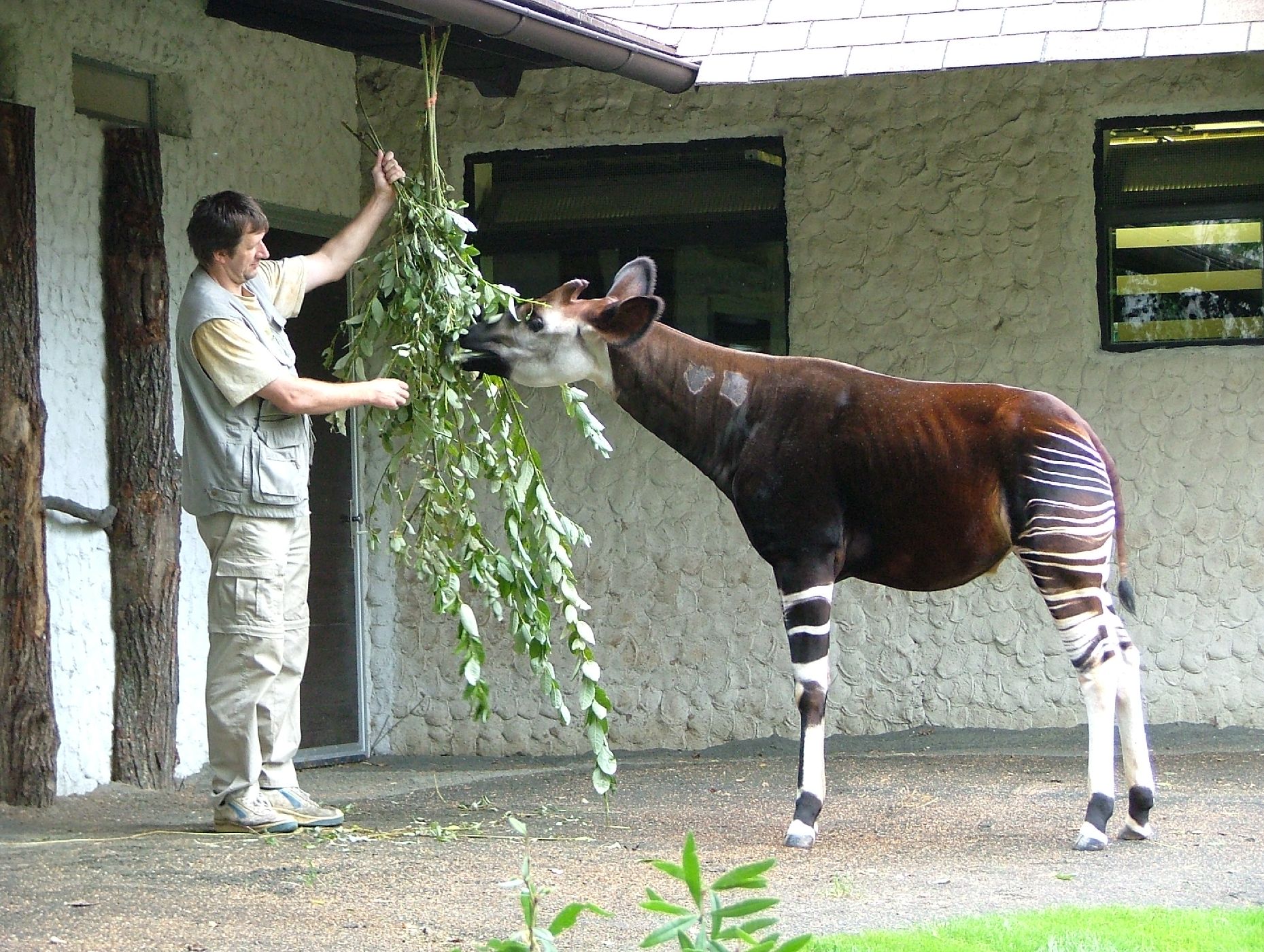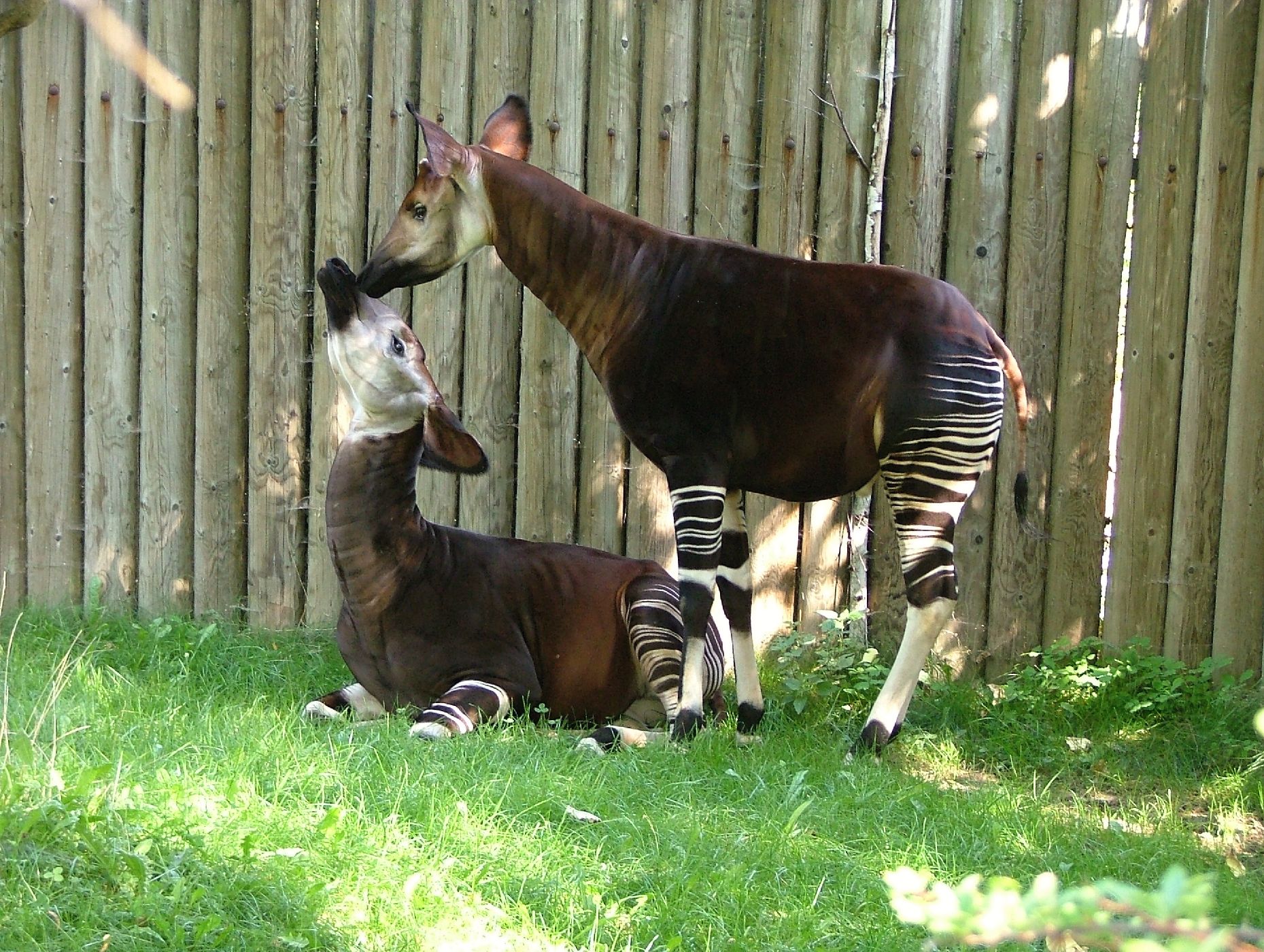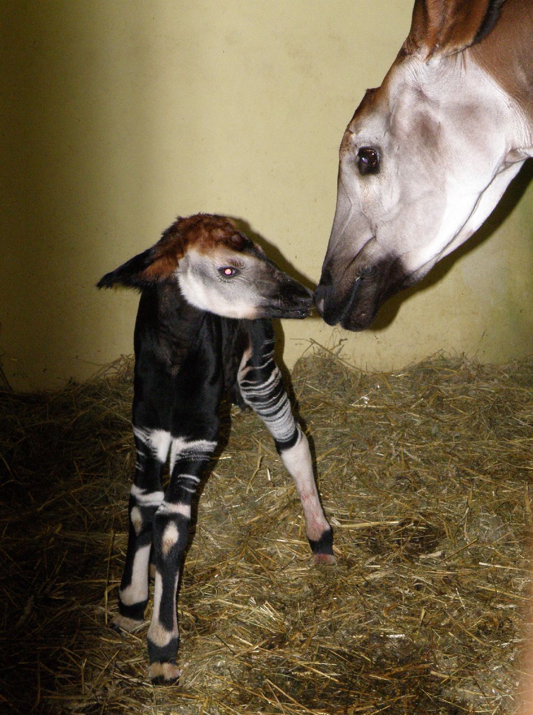 Samice s novorozeným mládětem v Zoo Dvůr Králové. Ze střední Evropy vlastní okapi pouze zoo ve Dvoře Králové, která je i v letech 2009 a 2011 rozmnožila, a zoo v polské Vratislavi.