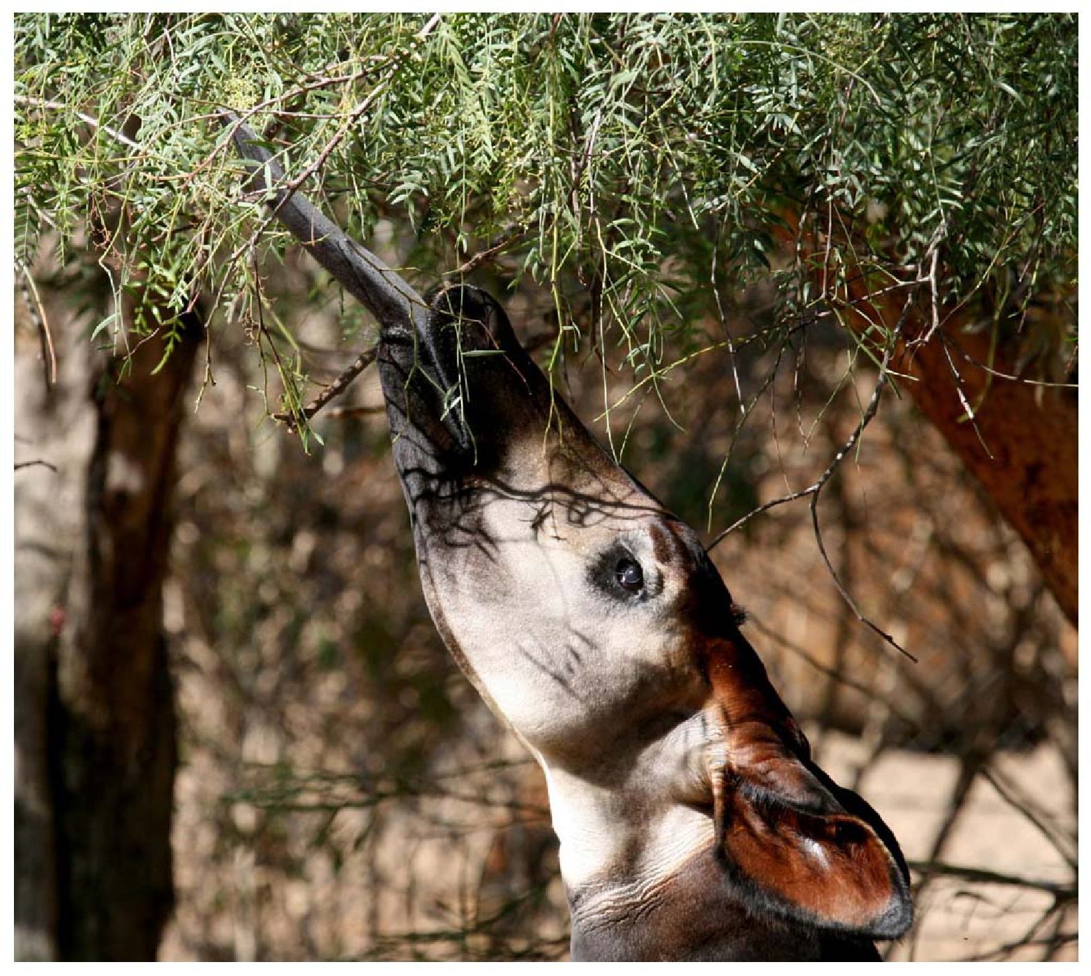 Stejně jako žirafa – nejbližší žijící příbuzný – má i okapi velmi dlouhý a obratný jazyk, který zvířeti umožňuje vybírat zelené listy i z velmi trnité vegetace