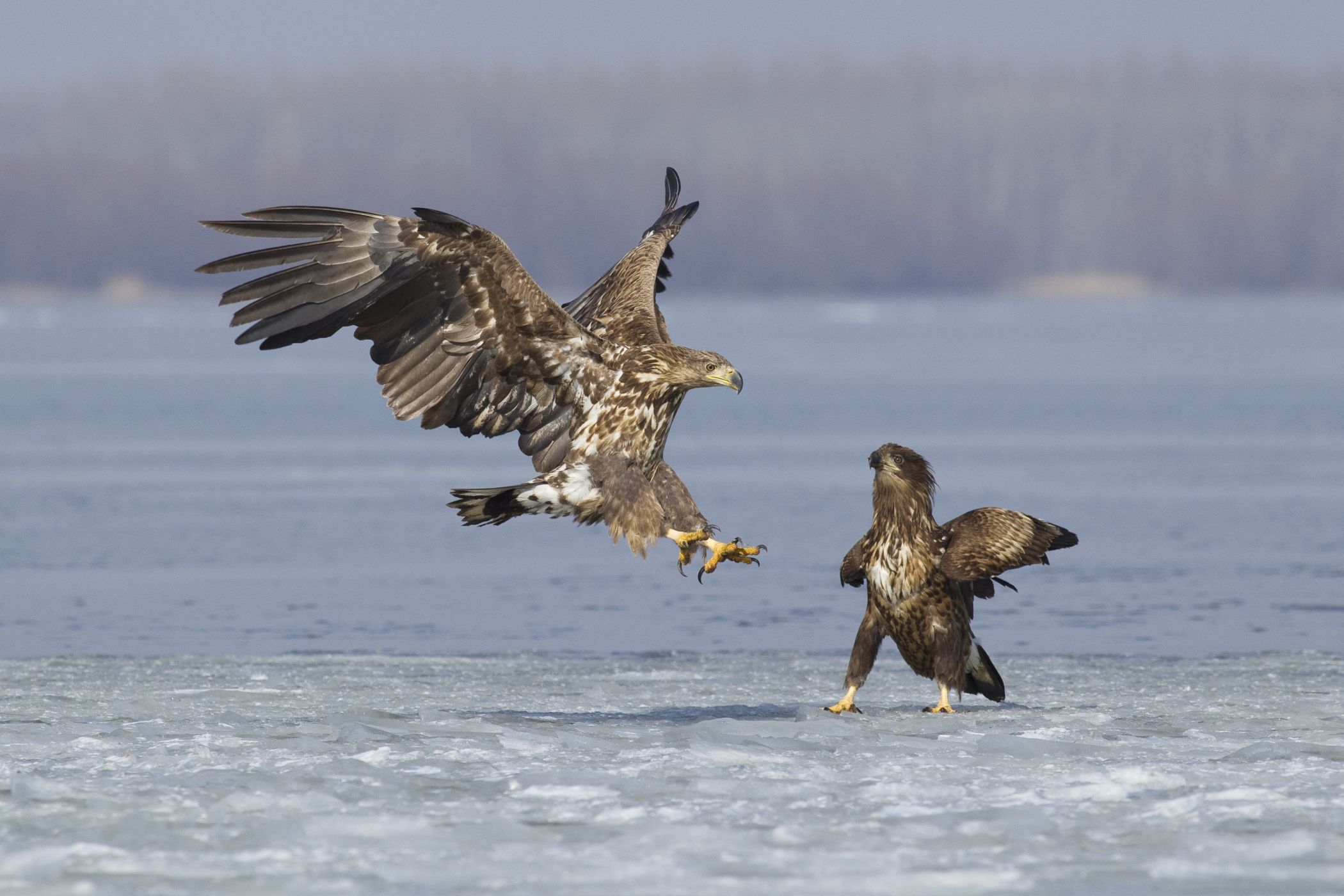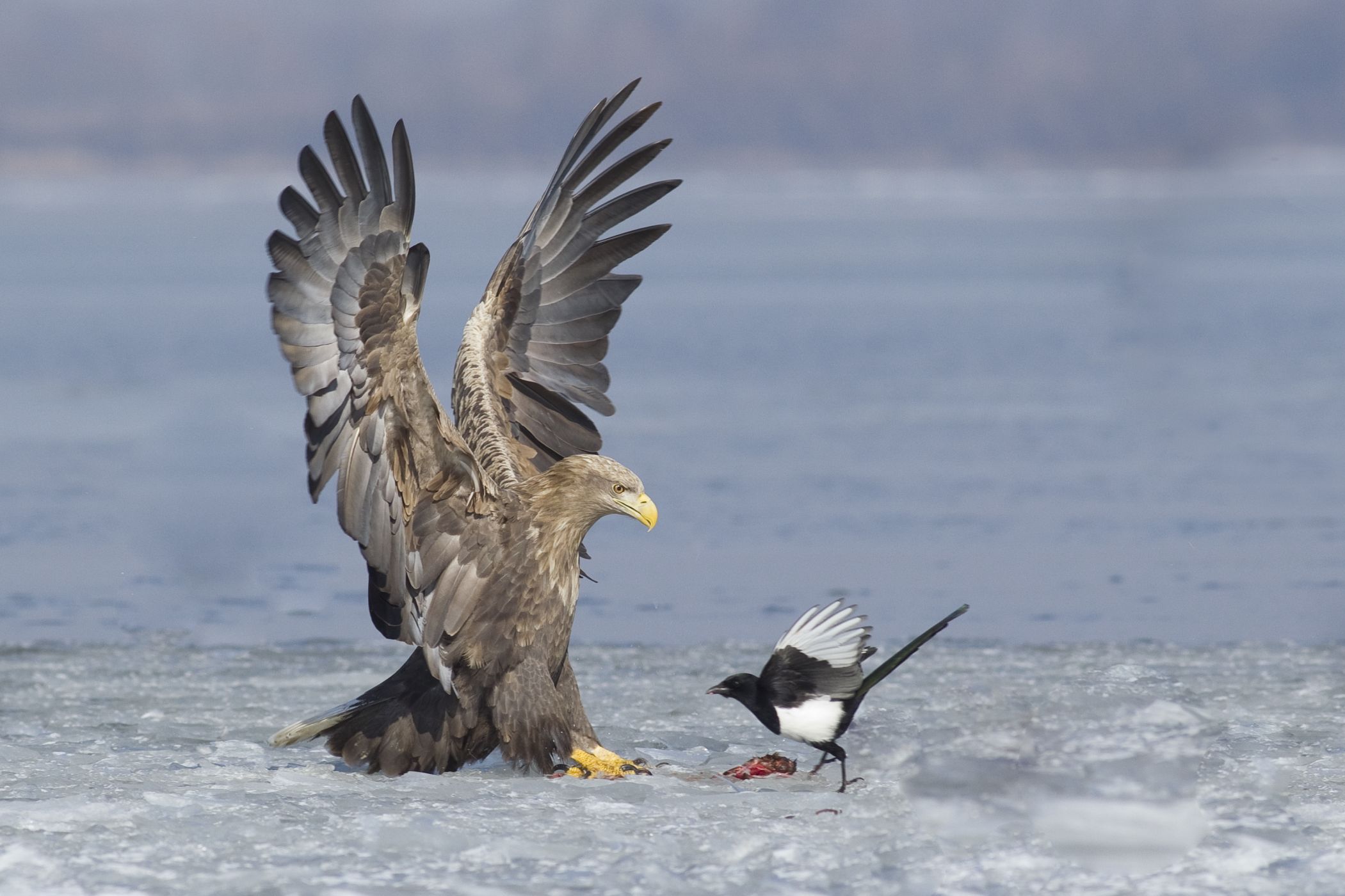 • Dospělý orel mořský a odvážná straka obecná, která se pokouší ukrást mnohem většímu dravci kus kořisti