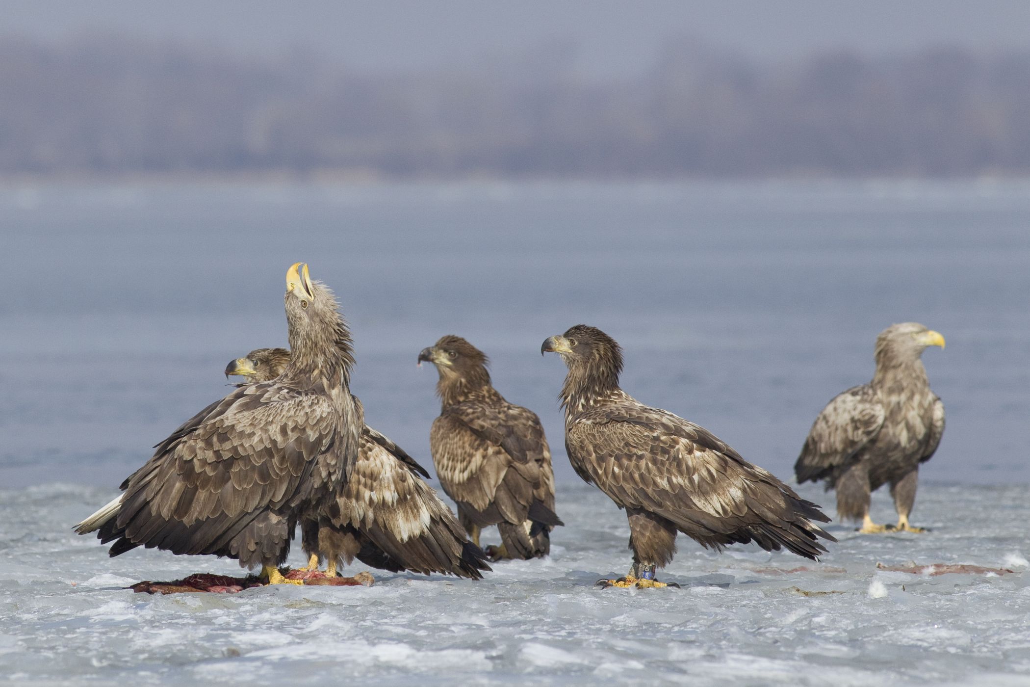 • Skupina orlů mořských, úplně vlevo (právě volající) a úplně vpravo jsou dospělí jedinci, uprostřed mezi nimi tři mladí orli mořští. Pro zajímavost – druhý orel zprava, mladý jedinec, má na noze kroužek, po zhotovení fotografie byl kroužek odečten a bylo zjištěno, že jedinec byl okroužkován 22. 5. 2009 v Polsku.
