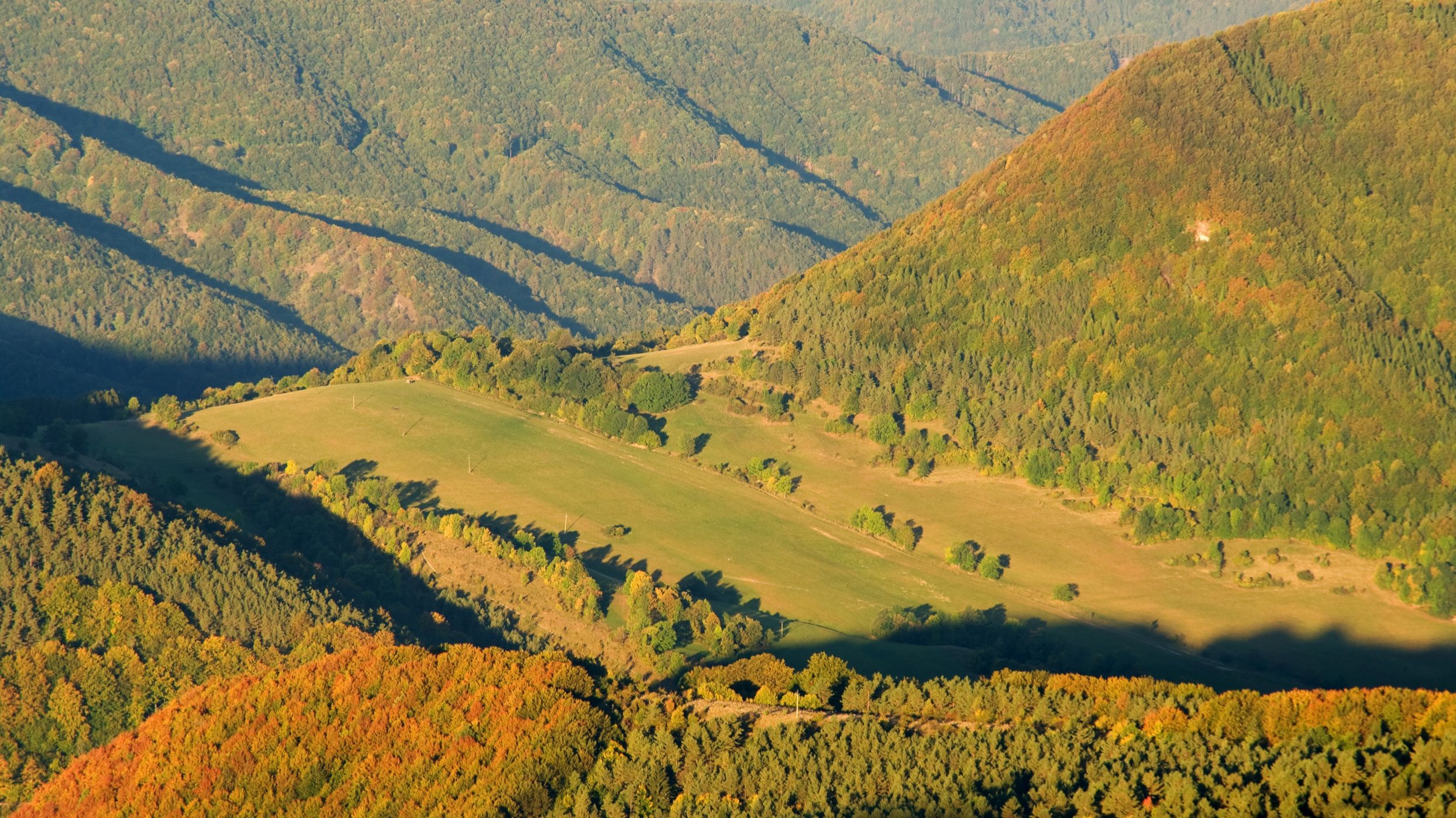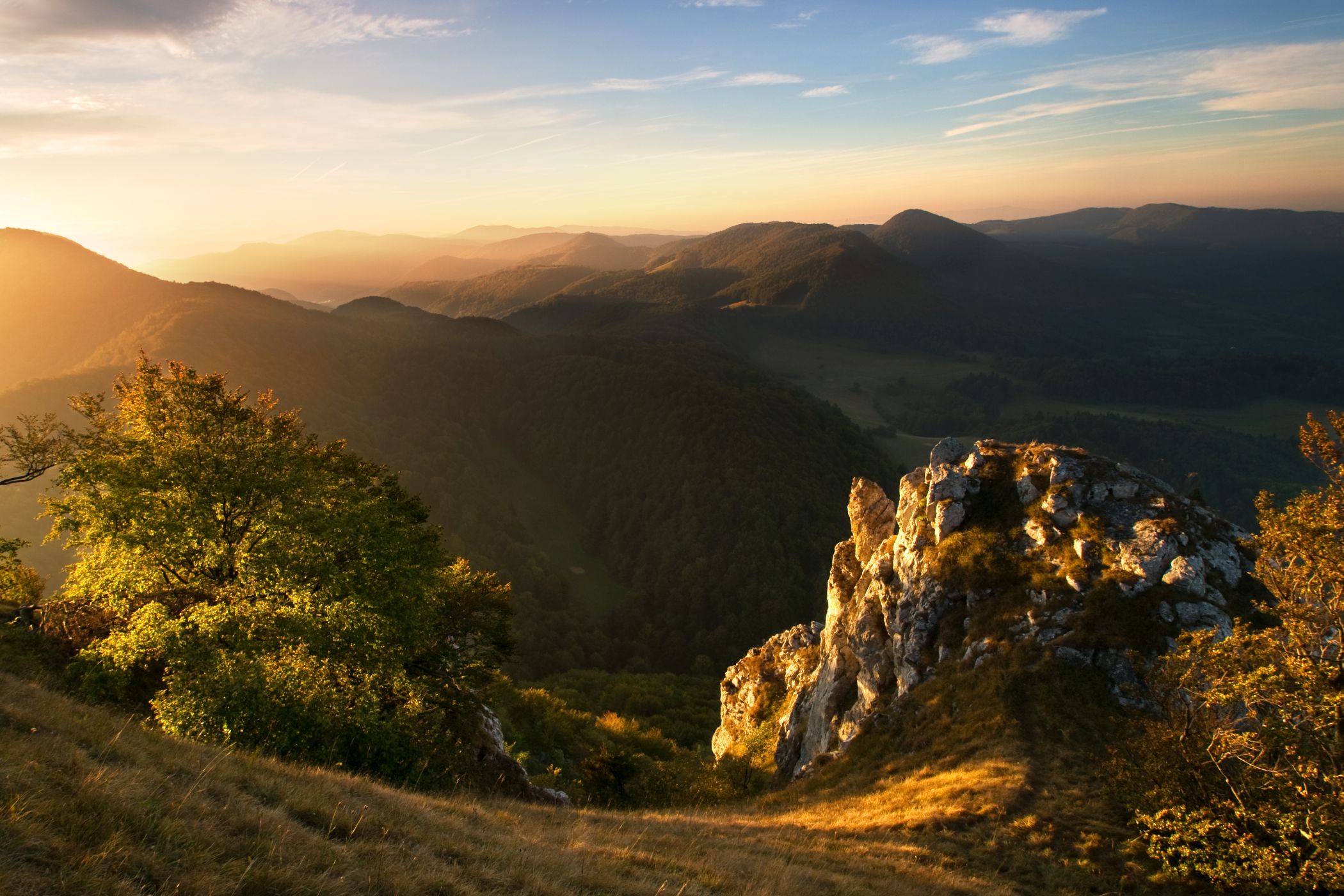 Vycházející slunce barví do zlatova opar, vznášející se nad kopci v okolí Vápče