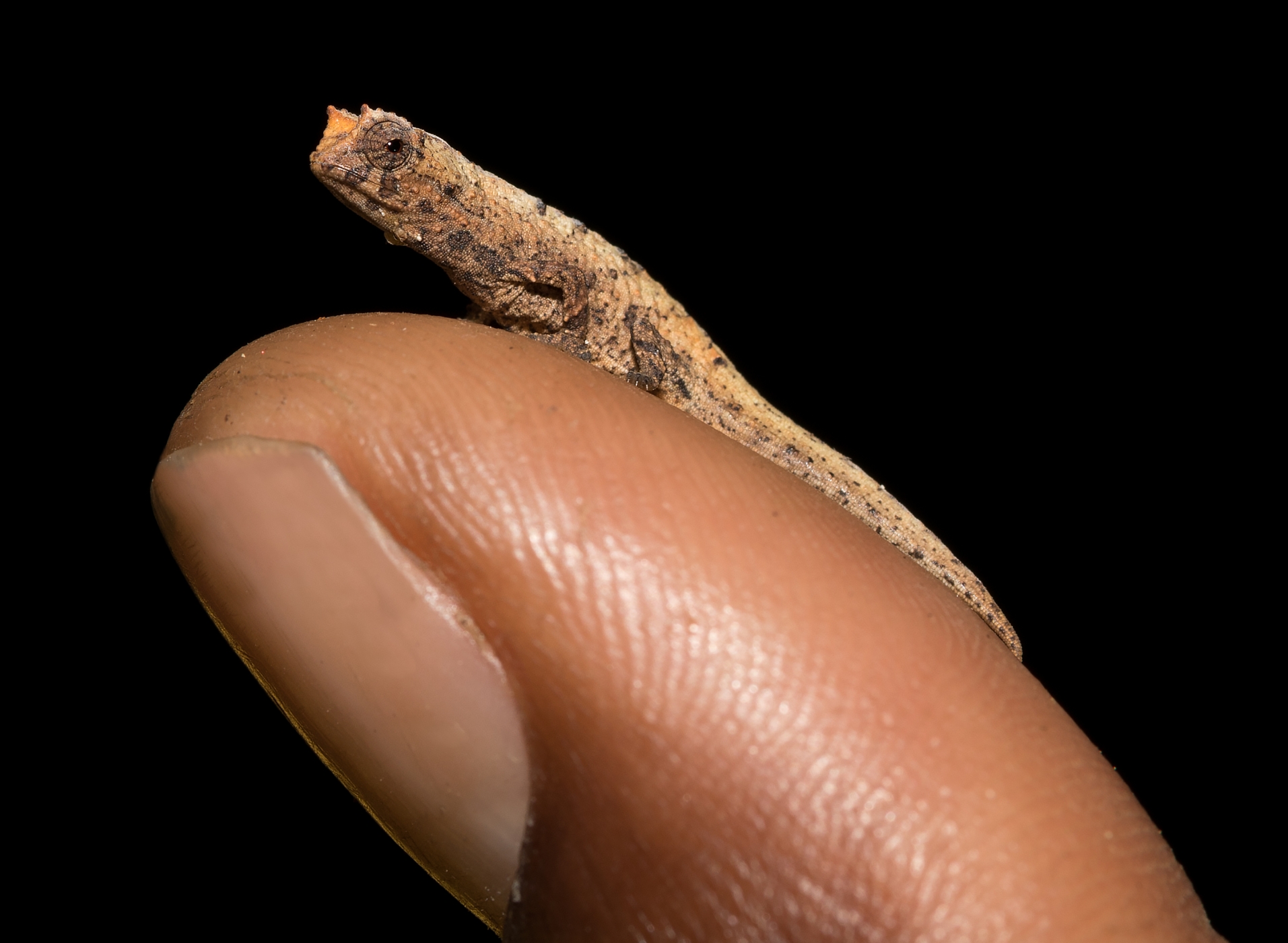 Nejmenší chameleon pojmenovaný Brookesia micra může pohodlně stát nejen na prstu, vešel by se ale i na hlavičku zápalky. (foto: iStock/Shutterstock)