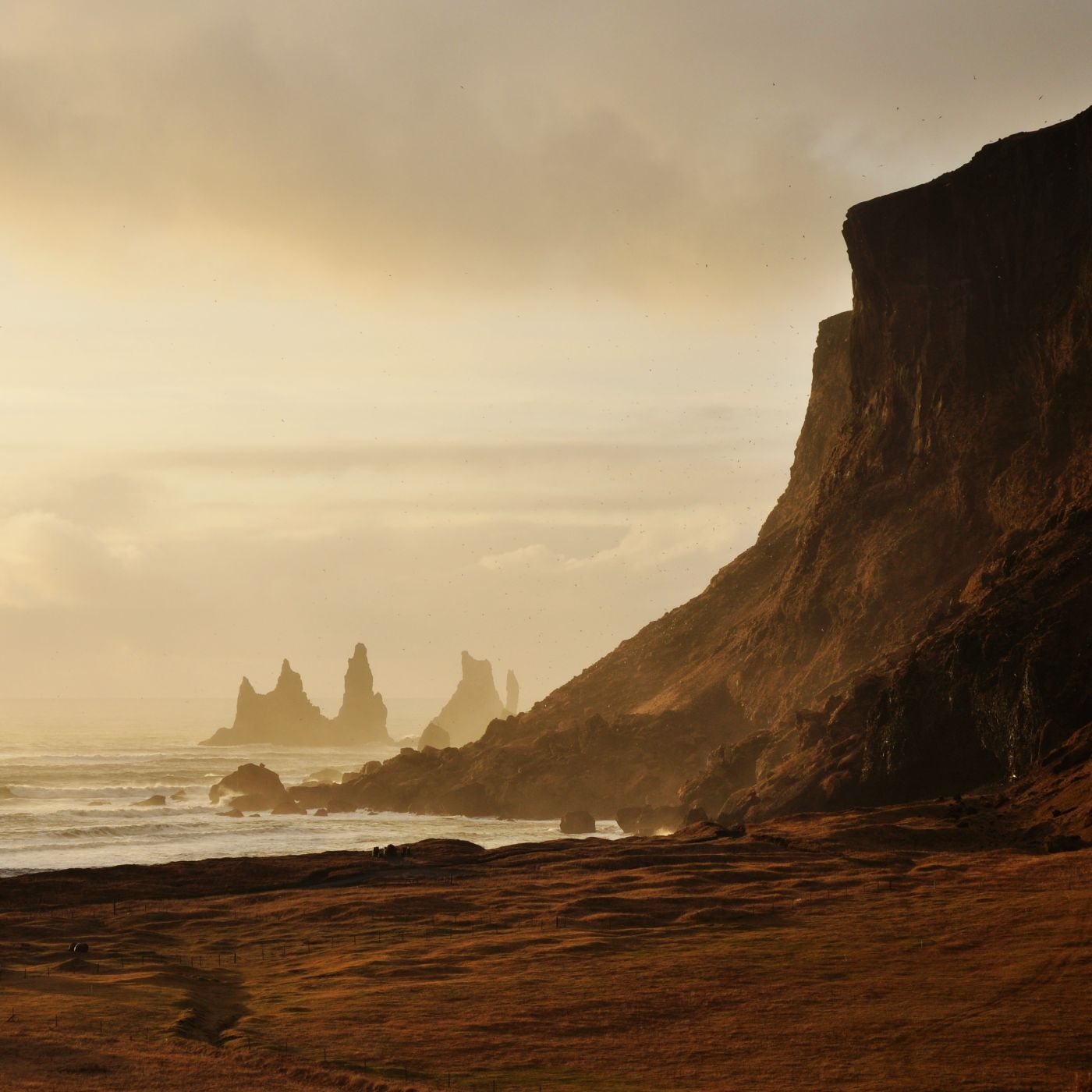 • Dramatické útesy na jižním pobřeží Islandu u vesnice Vík bičované větry a deštěm.