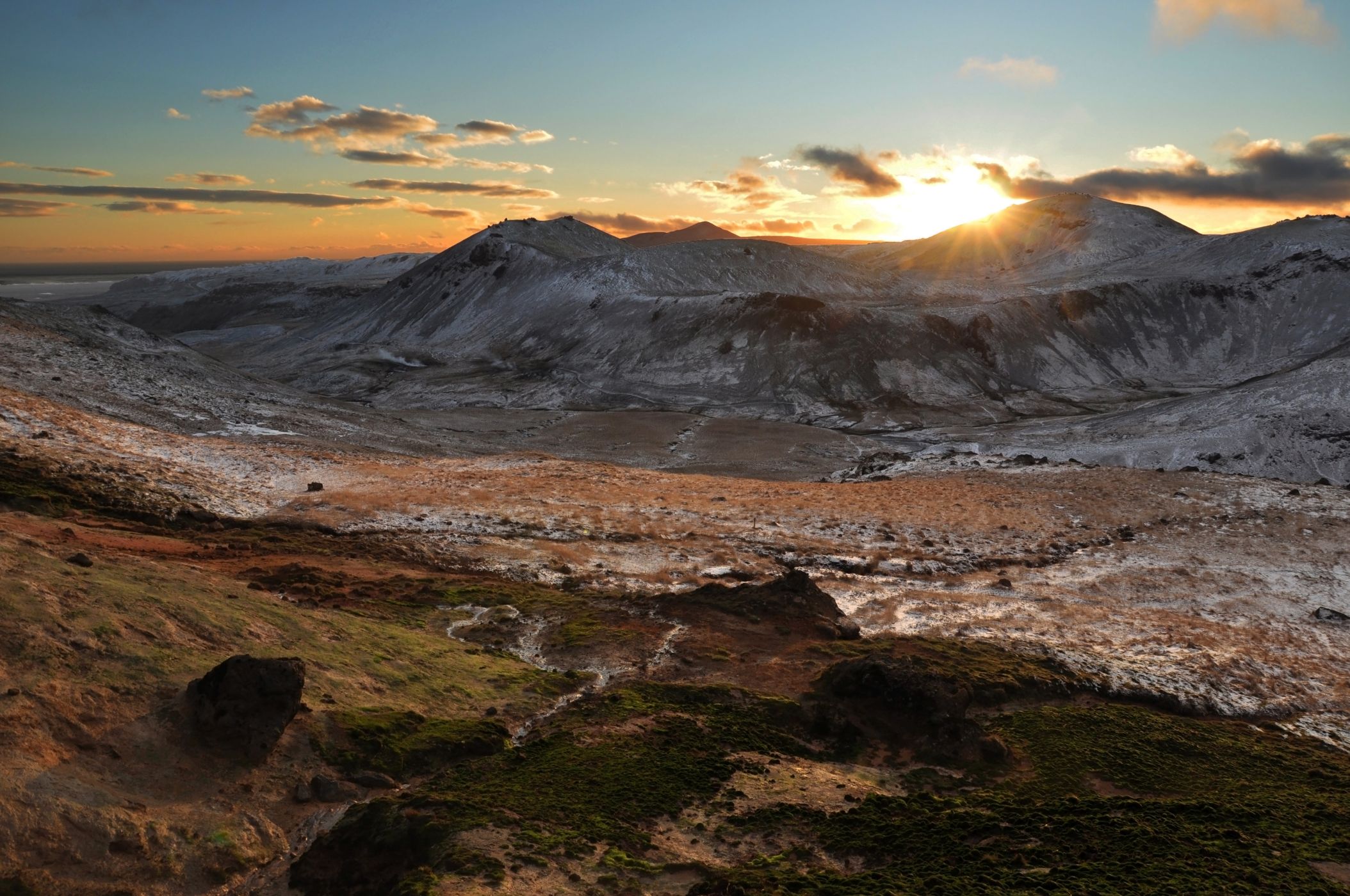 • Západ slunce nad údolím horké řeky Reykjadalur.