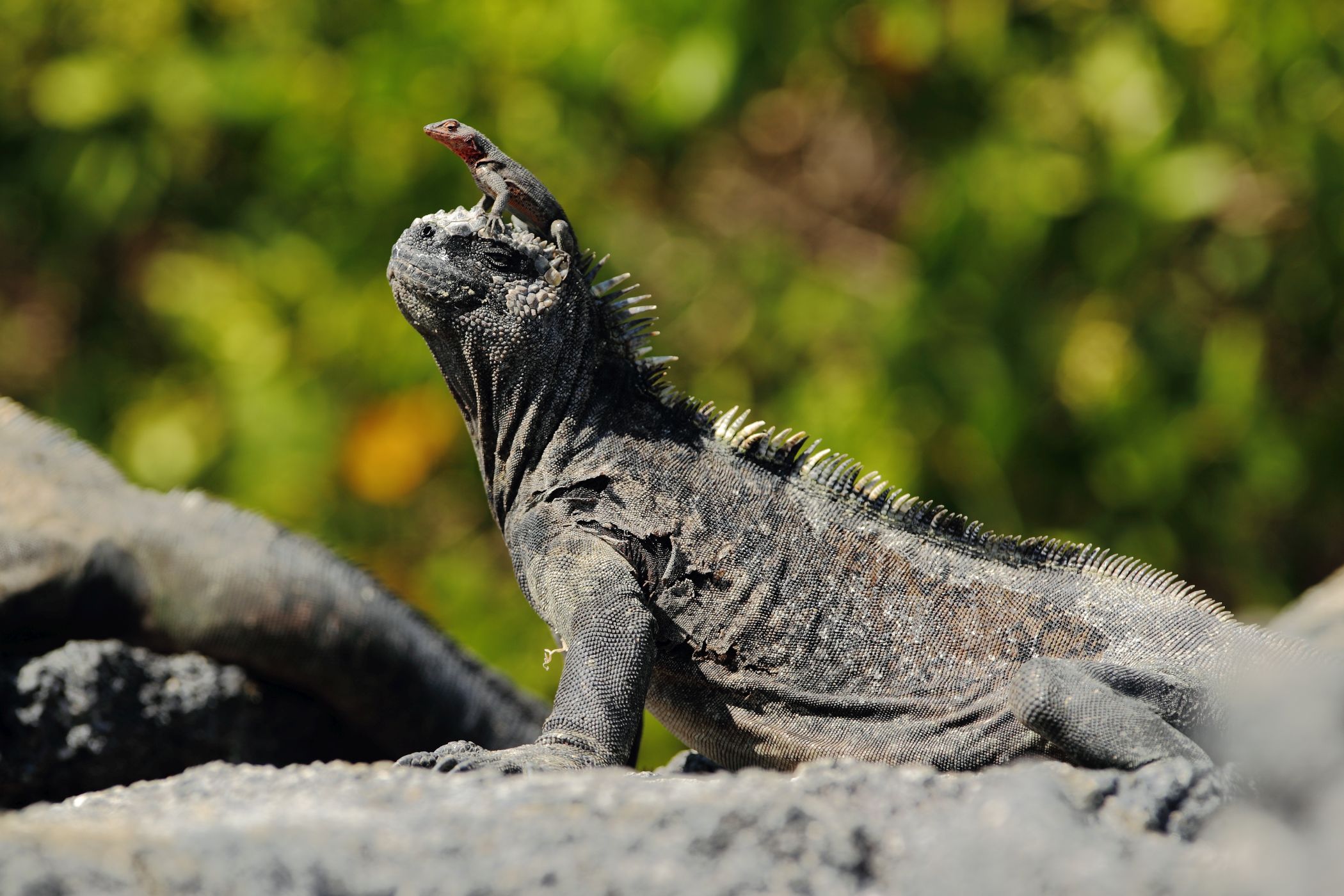 Ještěrka lávová vypadá na hlavě leguána mořského opravdu nepatrně. Galapážské ostrovy jsou součástí Ekvádoru. Od amerického kontinentu jsou vzdáleny bezmála tisíc kilometrů a díky této izolovanosti se na nich zachovaly unikátní živočišné druhy.