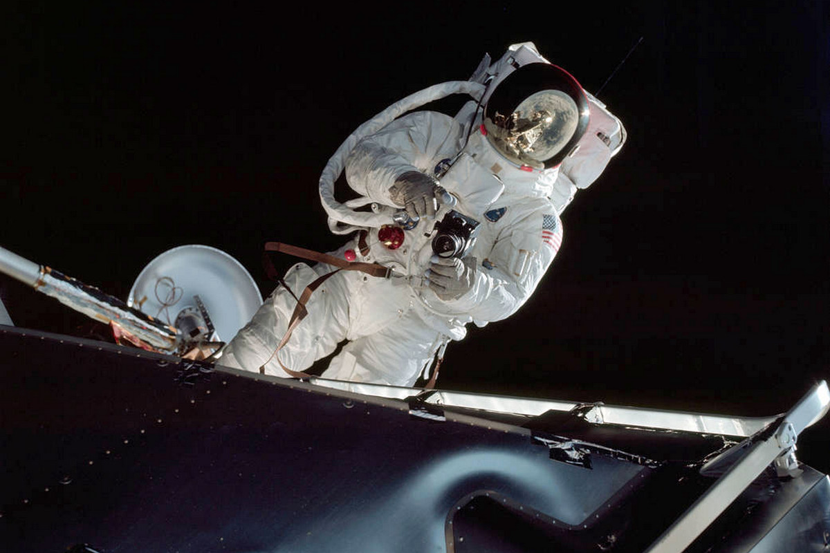Čtvrtý den mise: Schweickart při výstupu na vnější části lunárního modulu.