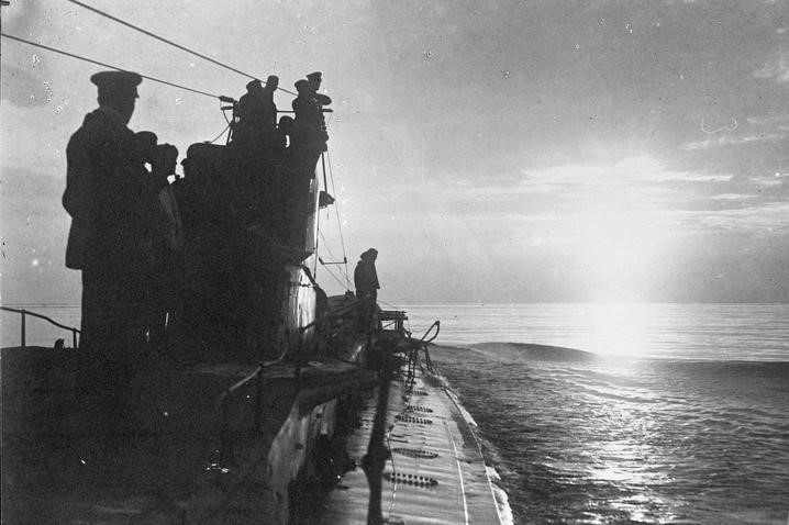 Téměř idylický pohled německé ponorky U-35 plující vstříc západu slunce kdesi ve Středozemním moři.