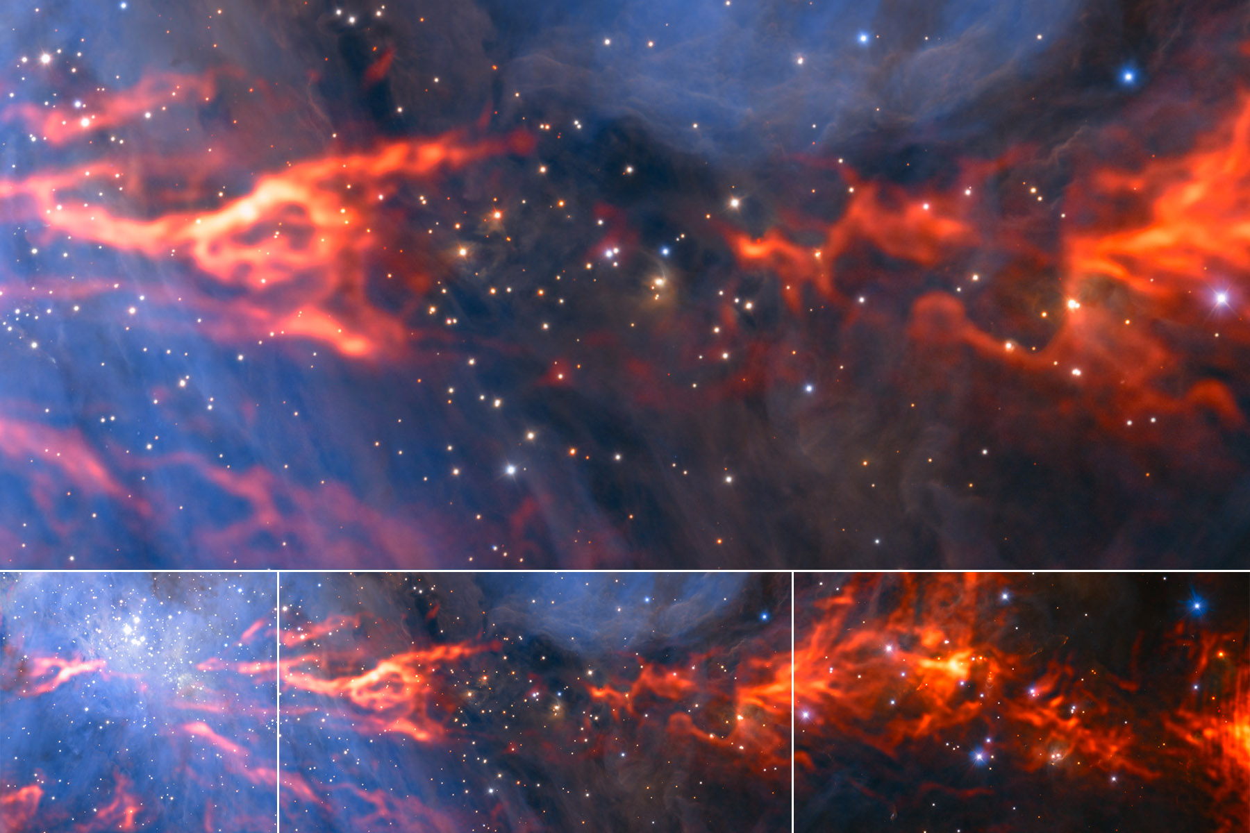 Vědci využili nová data získaná radioteleskopem ALMA a dalšími přístroji k zachycení jinak neviditelné pavučiny filamentů, která protkává Velkou mlhovinu v Orionu. Na snímku jsou tyto struktury zobrazeny teplými červenými a žlutými odstíny. Ve skutečnosti se jsou tyto útvary zcela nepozorovatelné.