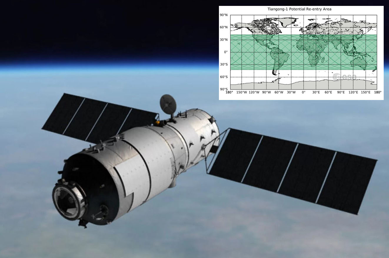 Dopad zbytků vesmírné stanice Tchien-kung 1 je odhadován kdekoli na mezi 43. stupněm severní šířky a 43. stupněm jižní šířky (vyznačeno zeleně).