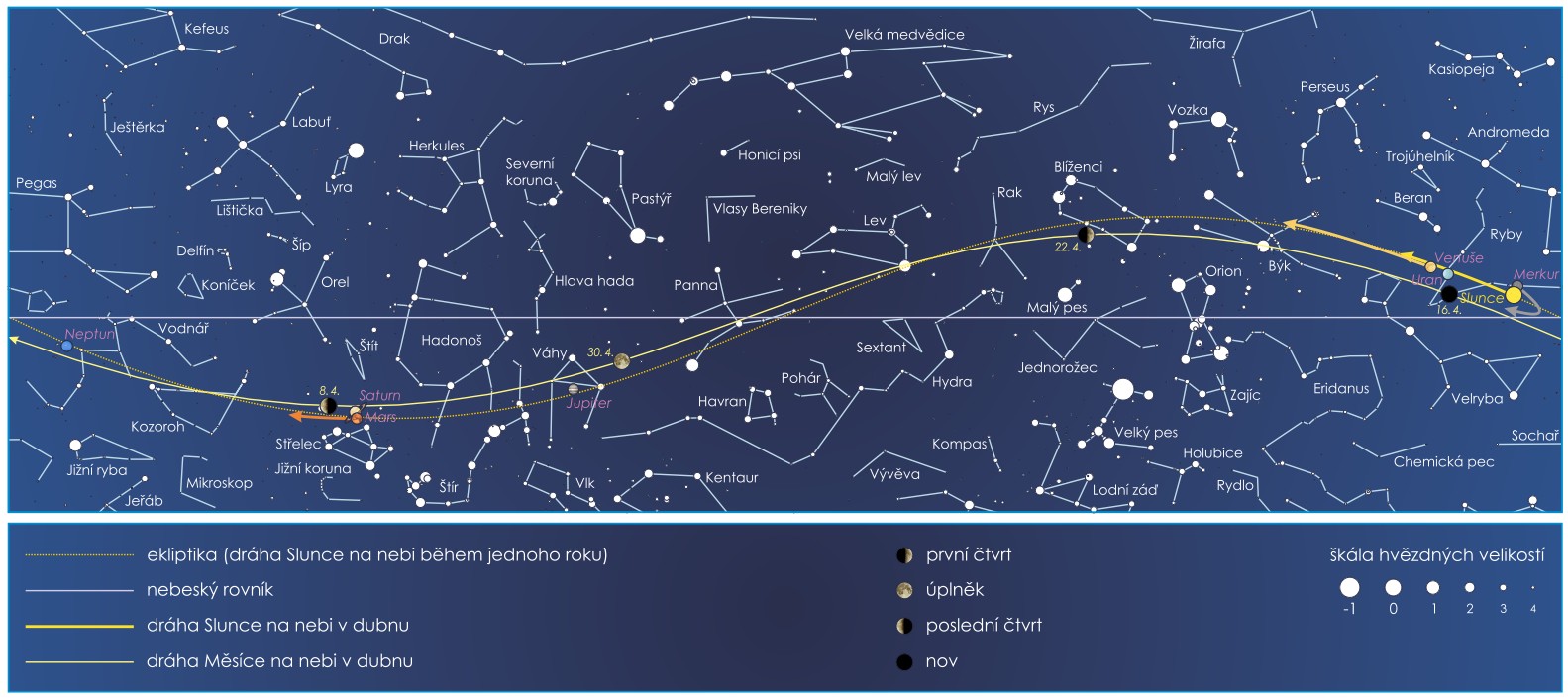 Obdélníková mapa uvádí přibližné polohy významných těles Sluneční soustavy na dubnovém nebi. U Měsíce jsou zvýrazněny pozice (včetně přesného data), v nichž nastává první čtvrt, úplněk, poslední čtvrt a nov.