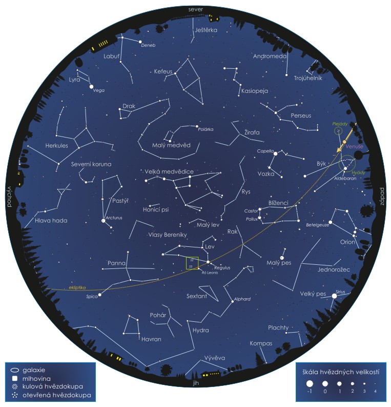 Kruhová mapa zobrazuje podobu nočního nebe 15. dubna 2018 ve 22:00 středoevropského letního času (SELČ). Na počátku měsíce platí pro 23:00 SELČ, na jeho konci pro 21:00 SELČ.