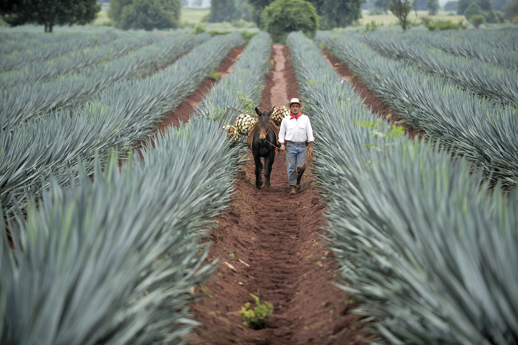 Muž procházející polem modré agáve v době sklizně poblíž mexického města Jalisco, které je úzce spjato s výrobou tequily.
