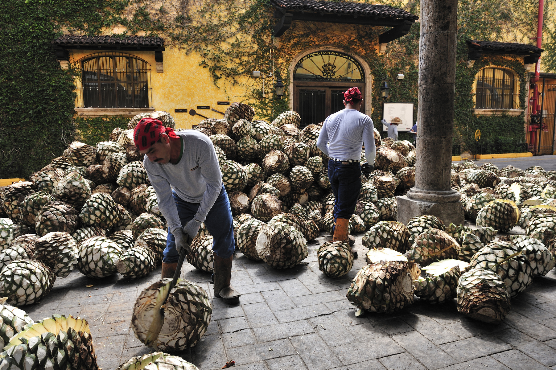 Dělníci rozsekávají plody agáve na nádvoří palírny Jose Cuervo v mexickém Jaliscu.