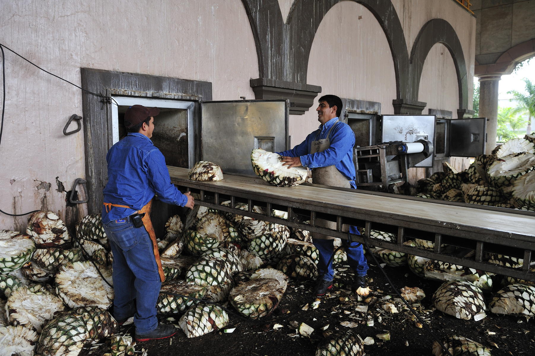 Pracovníci palírny Herradura nakládají rozsekané plody agáve na dopravní pás, jenž směřuje k cihlovým pecím.