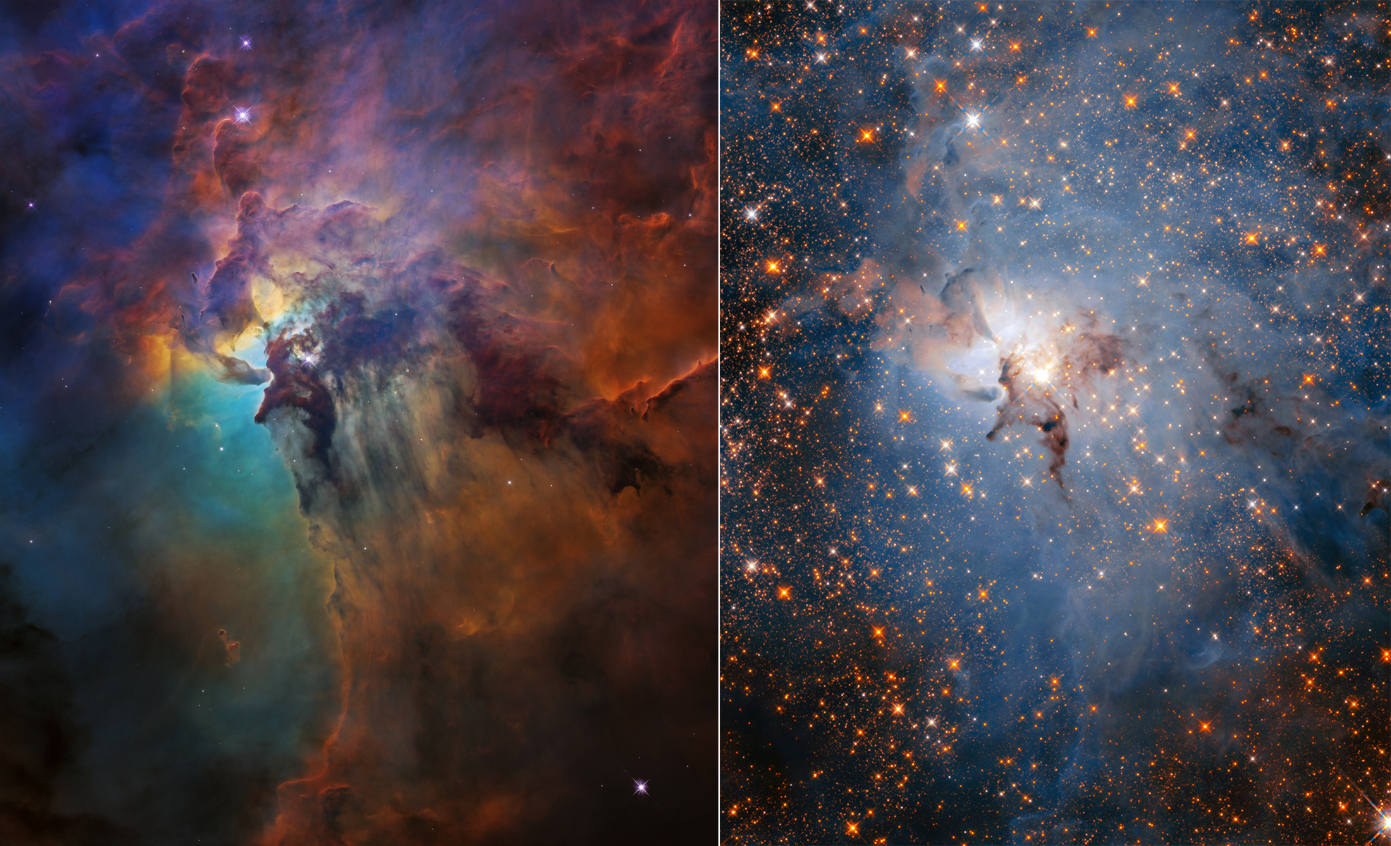 Mlhovina Laguna ve viditelném a v infračerveném světle (vpravo).