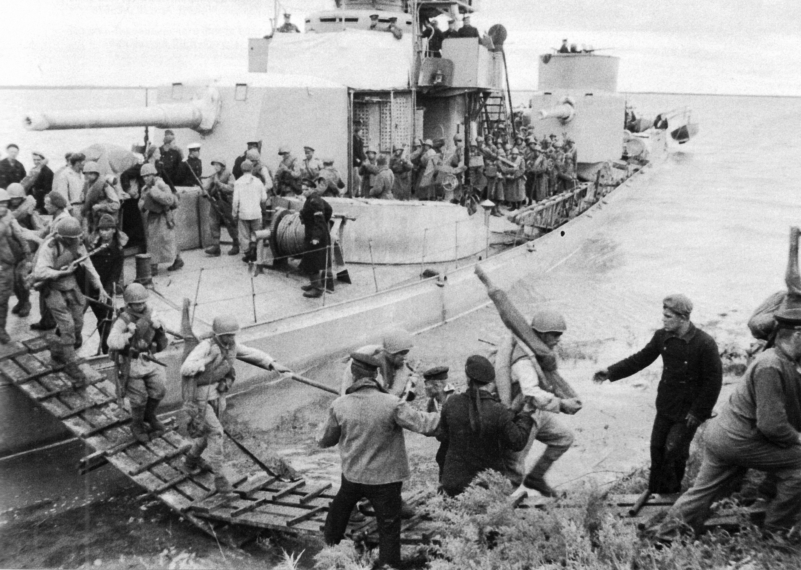 Sovětský monitor třídy Škval patřící do Amurské flotily vysazuje desant na břehu řeky Sungari