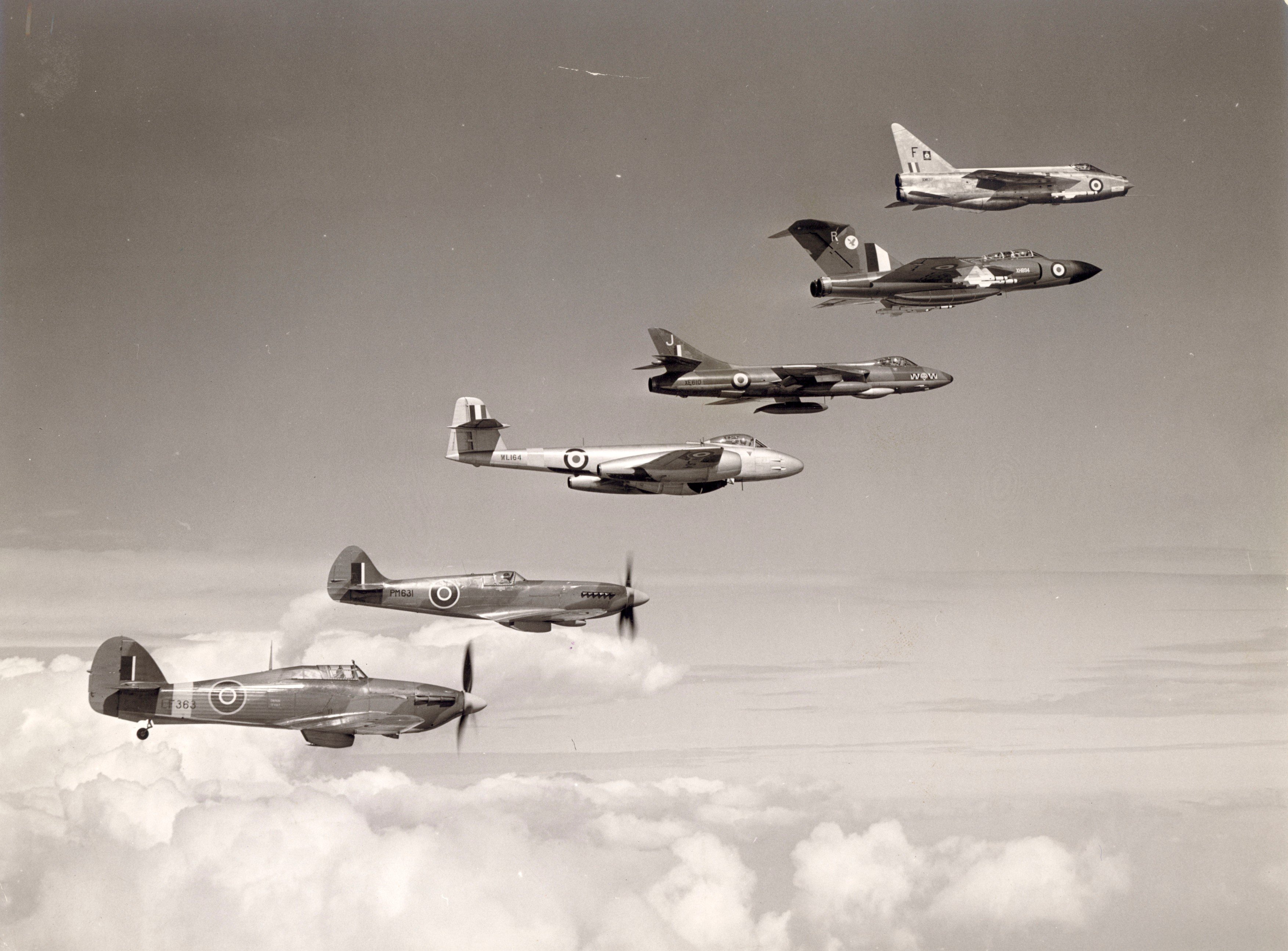 Zleva Hawker Hurricane Mk.IIC, upermarine Spitfire PR Mk.XIX, Gloster Meteor F Mk.8, Hawker Hunter F.6, Gloster Javelin FAW Mk.9 a English Electric Lightning F.1
