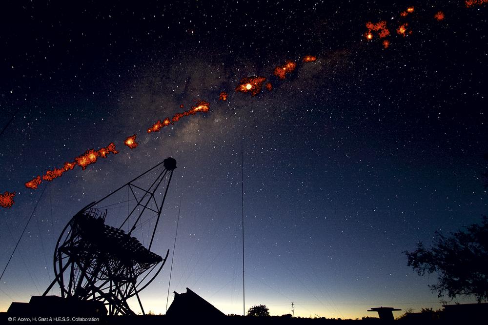 Zdroje gama záření na snímku oblohy s teleskopem HESS a Mléčnou dráhou.