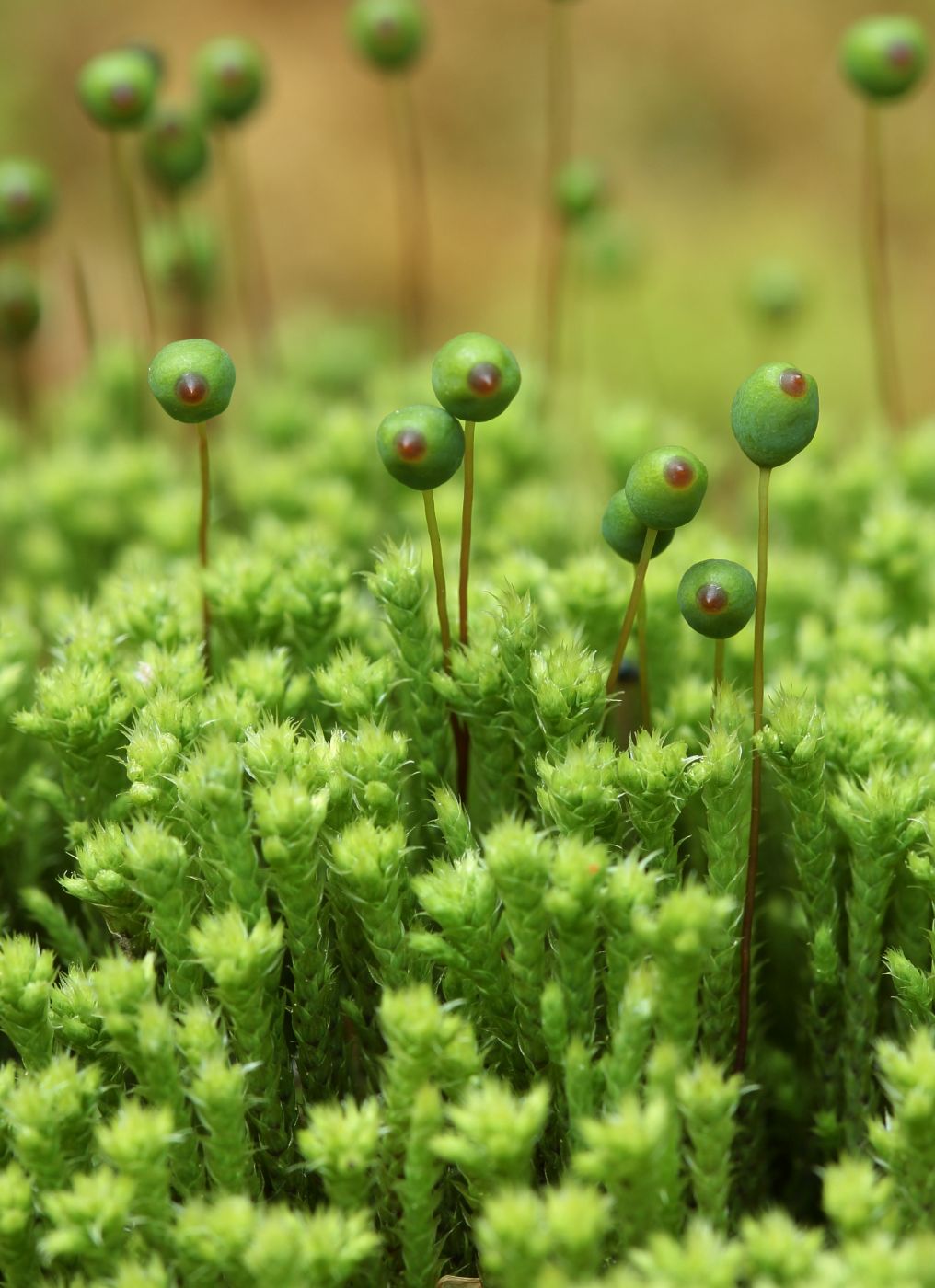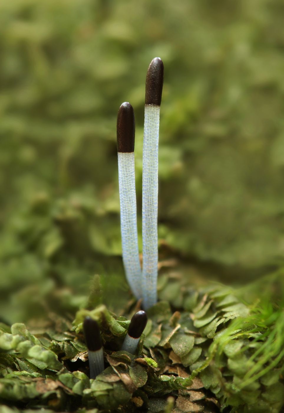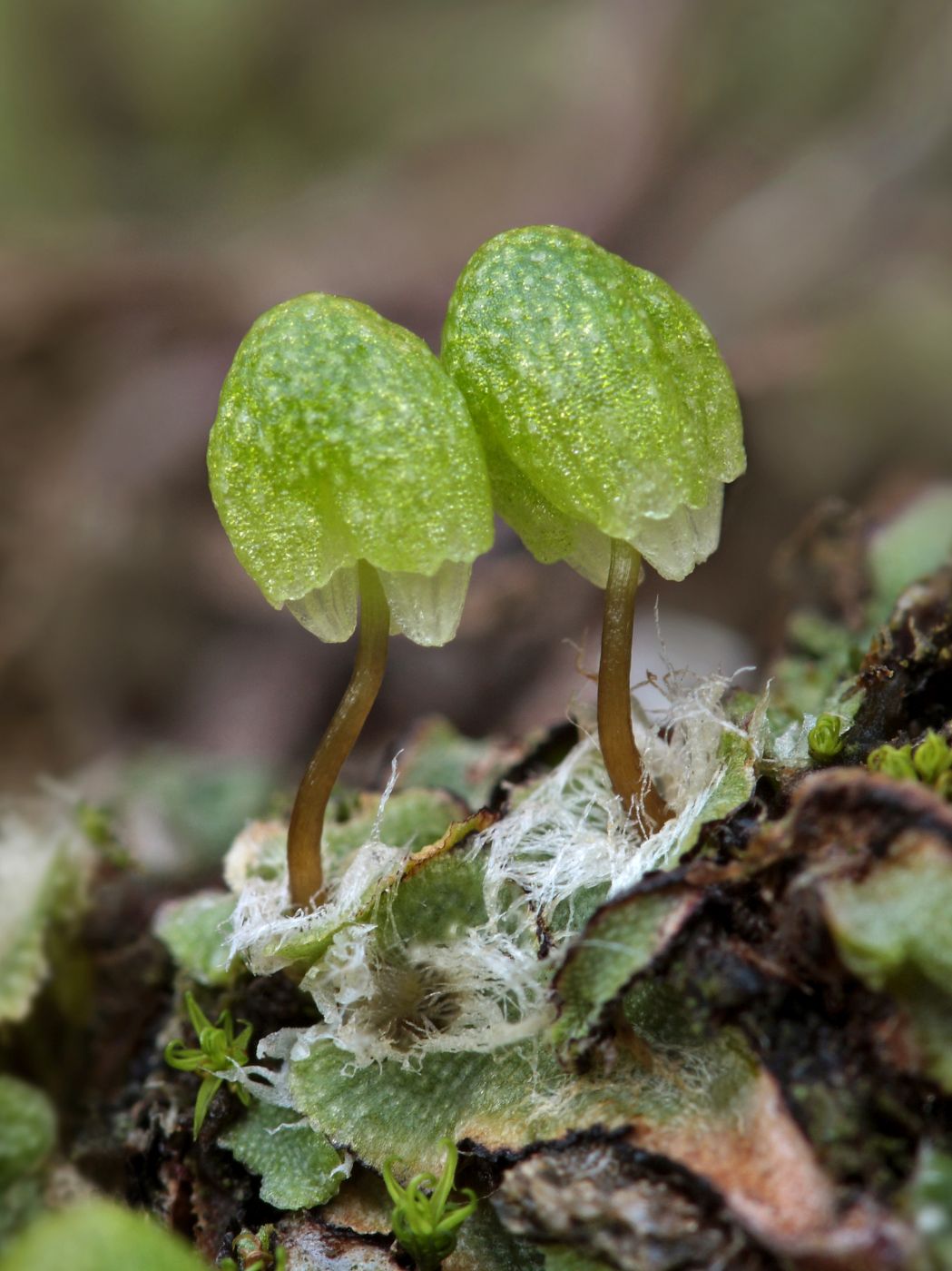 Šikoušek zelený (Buxbaumia viridis) je nenápadný mech, rostoucí převážně na tlejícím dřevě v lesích. V jeho tobolkách se tvoří i více než pět milionů výtrusů. Je pozorovatelný prakticky jen ve stádiu, kdy tvoří štět a tobolku (na snímku)