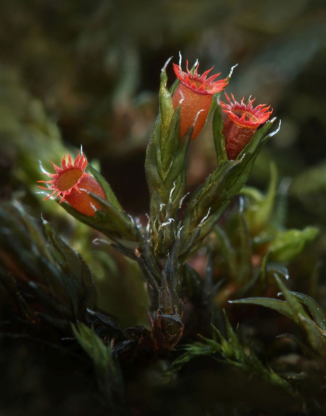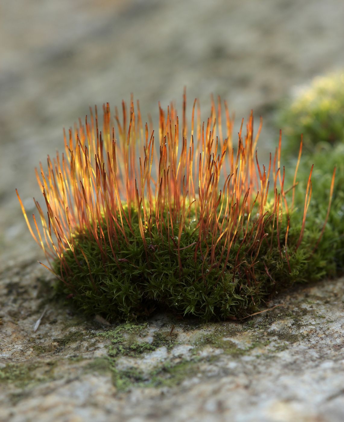 Klanozoubek zmatkotvorný (Schistidium confusum). Krásně zbarvené jsou zuby na tobolkách tohoto mechu